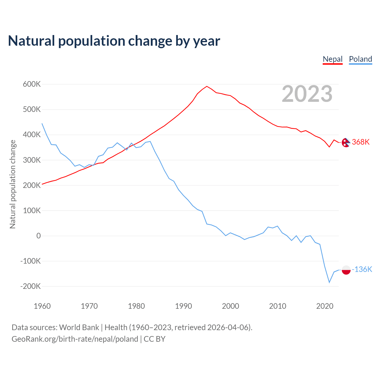 According to the latest available data on birth rates, the fertility rate in Nepal was 1.98 children per woman in 2023, compared to 1.16 in Poland in 2023. The replacement level is considered to be 2.1 children per woman.