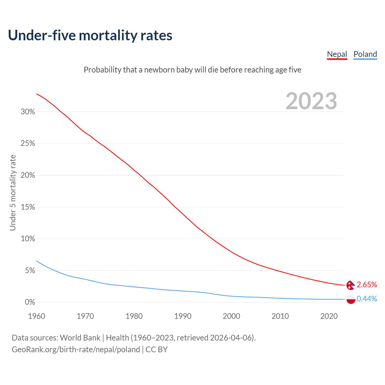 The chance that a newborn baby will die before reaching age five is 2.65% in Nepal and 0.44% in Poland. Above is a chart with historical data on under-five mortality rates.