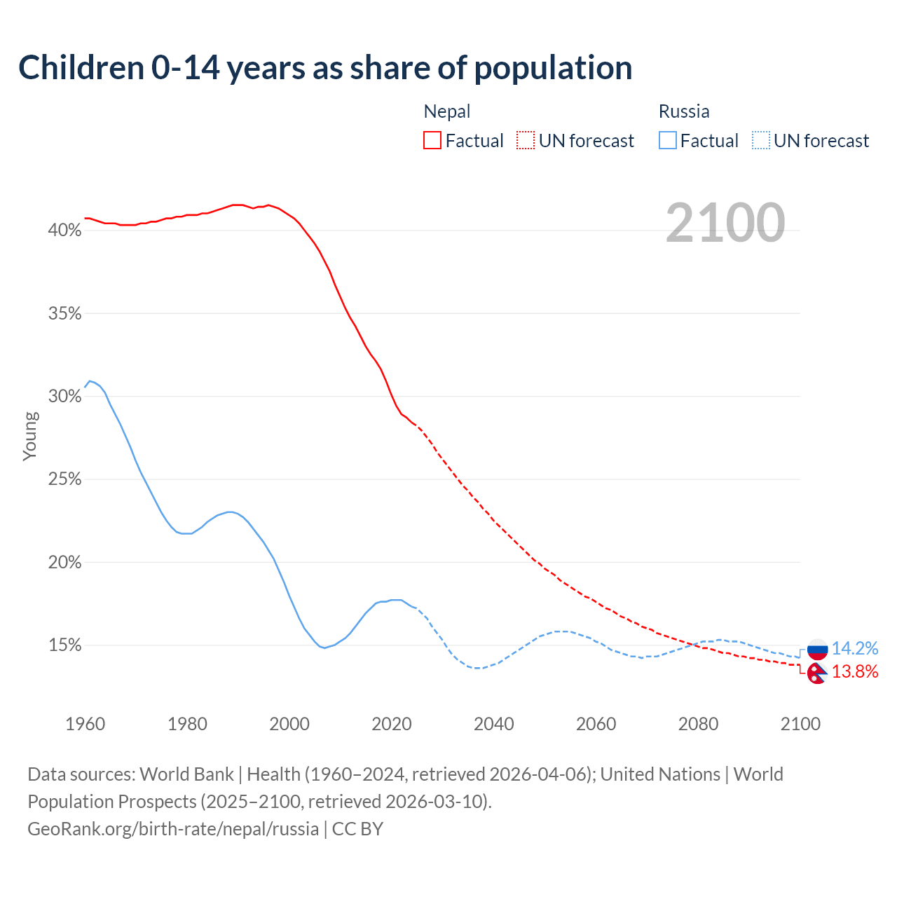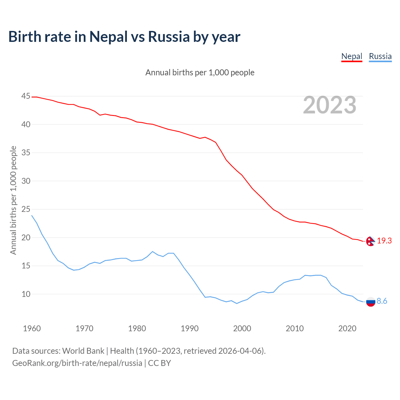 Nepal has an annual birth rate of 19.3 births per 1,000 people, compared to 8.6 for Russia. The average number of children a woman is expected to have during her lifetime — the fertility rate, is 1.98 in Nepal and 1.41 in Russia — 28.9% difference.