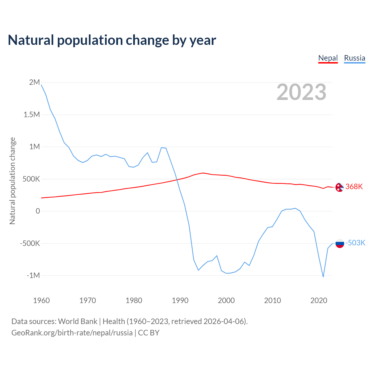 According to the latest available data on birth rates, the fertility rate in Nepal was 1.98 children per woman in 2023, compared to 1.41 in Russia in 2023. The replacement level is considered to be 2.1 children per woman.