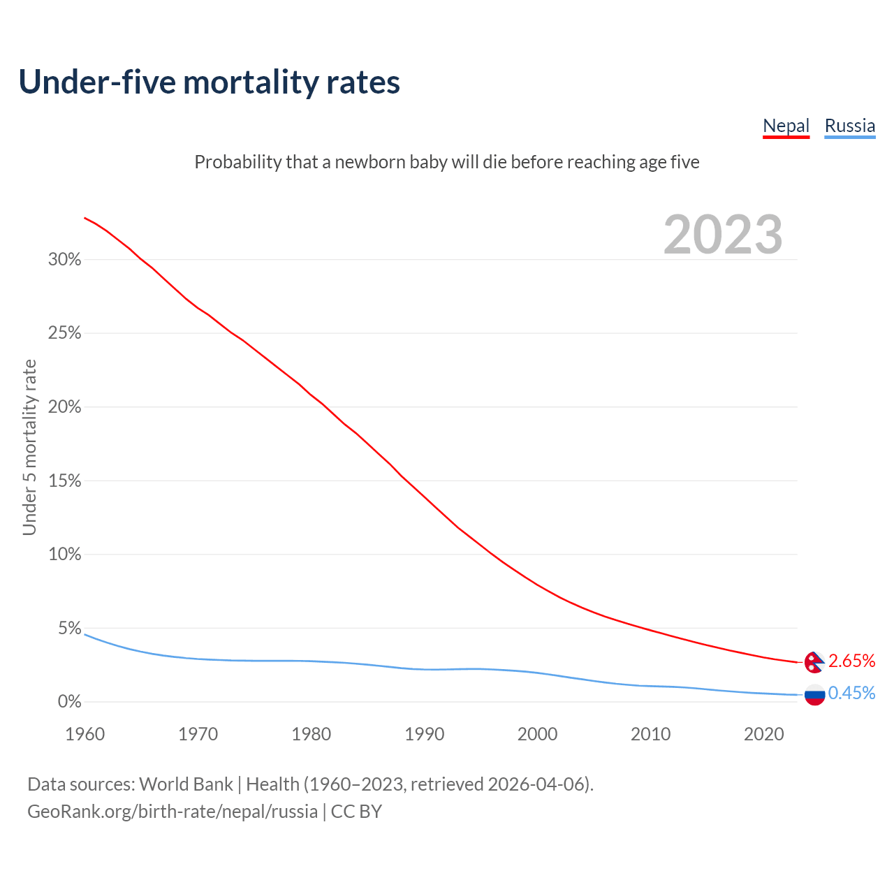 The chance that a newborn baby will die before reaching age five is 2.65% in Nepal and 0.45% in Russia. Above is a chart with historical data on under-five mortality rates.