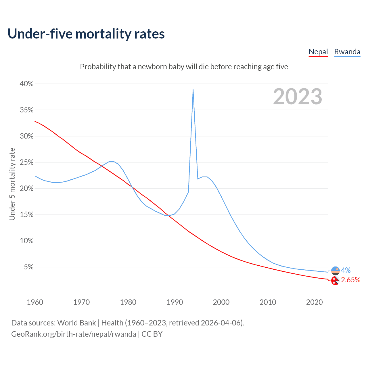 The chance that a newborn baby will die before reaching age five is 2.65% in Nepal and 4% in Rwanda. Above is a chart with historical data on under-five mortality rates.