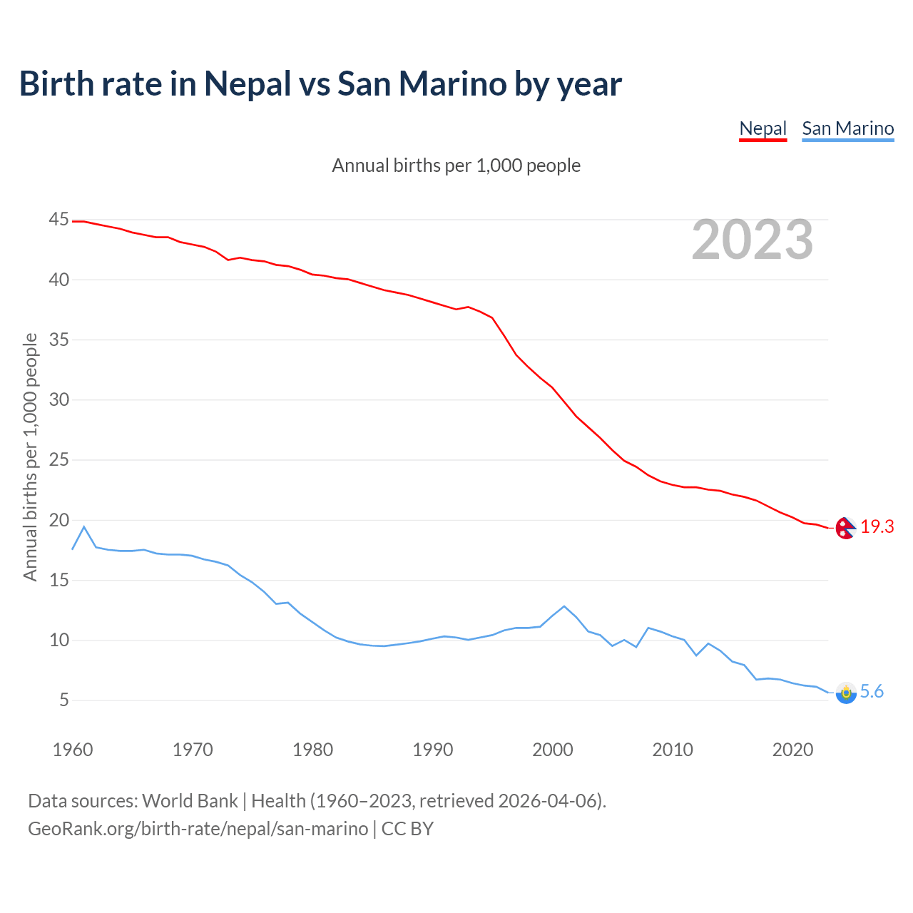 Nepal has an annual birth rate of 19.3 births per 1,000 people, compared to 5.6 for San Marino. The average number of children a woman is expected to have during her lifetime — the fertility rate, is 1.98 in Nepal and 1.15 in San Marino — 42.1% difference.