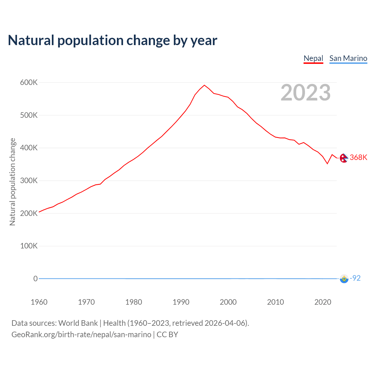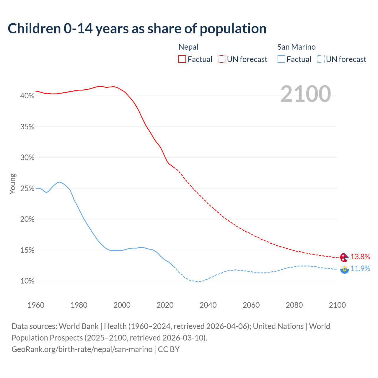 According to the latest available data on birth rates, the fertility rate in Nepal was 1.98 children per woman in 2023, compared to 1.15 in San Marino in 2023. The replacement level is considered to be 2.1 children per woman.