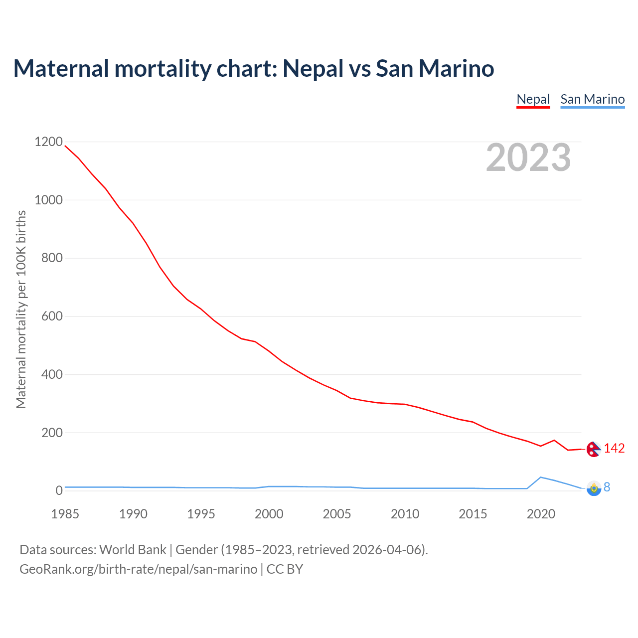 The maternal mortality rate, which is the probability of dying during childbirth or within 42 days of pregnancy termination, is 142 deaths per 100,000 live births in Nepal, compared to 8 deaths in San Marino.