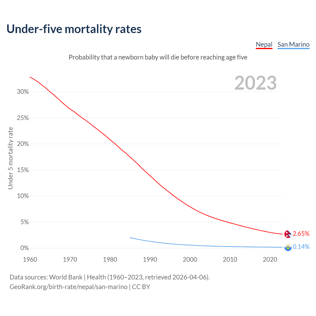 The chance that a newborn baby will die before reaching age five is 2.65% in Nepal and 0.14% in San Marino. Above is a chart with historical data on under-five mortality rates.