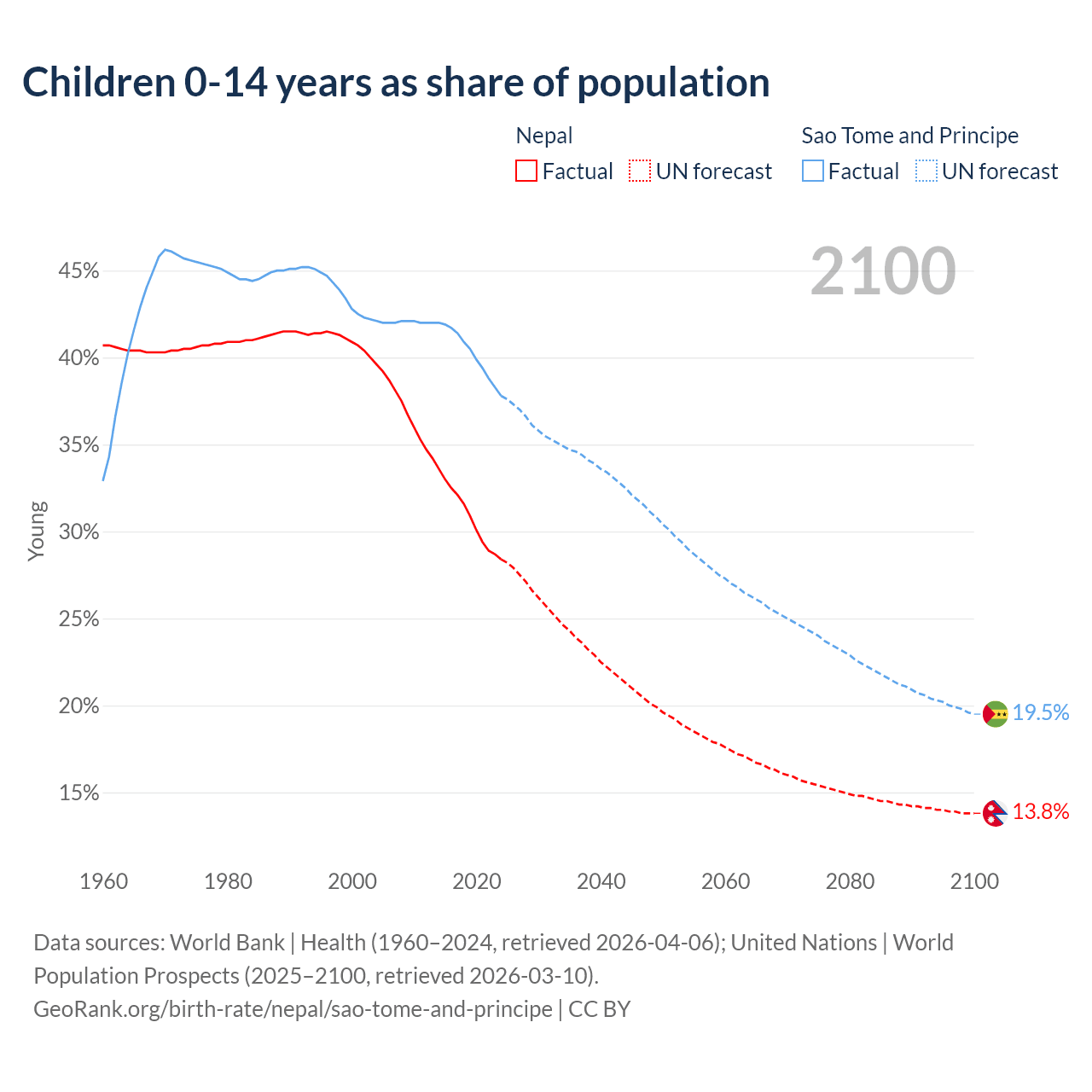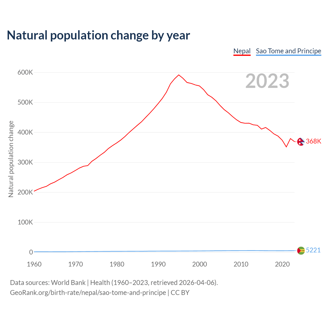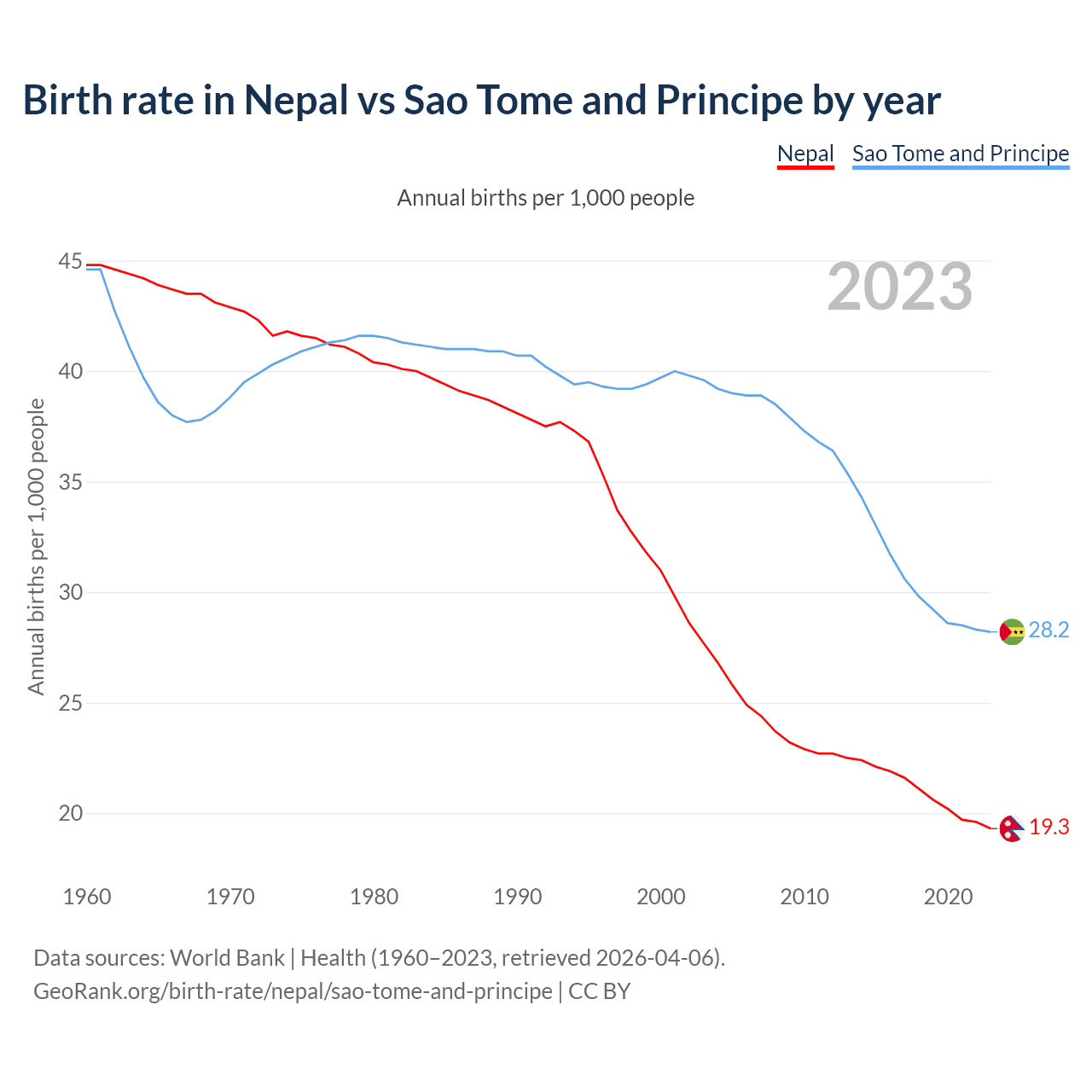 Nepal has an annual birth rate of 19.3 births per 1,000 people, compared to 28.2 for Sao Tome and Principe. The average number of children a woman is expected to have during her lifetime — the fertility rate, is 1.98 in Nepal and 3.64 in Sao Tome and Principe — 83.7% difference.