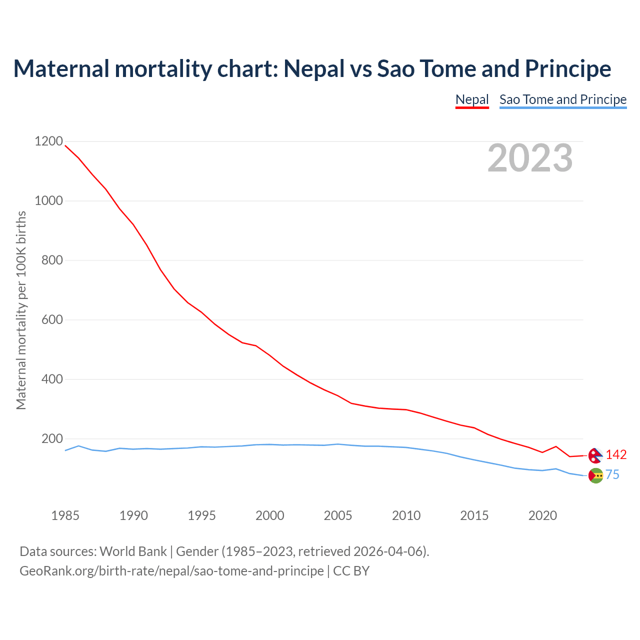 The maternal mortality rate, which is the probability of dying during childbirth or within 42 days of pregnancy termination, is 142 deaths per 100,000 live births in Nepal, compared to 75 deaths in Sao Tome and Principe.
