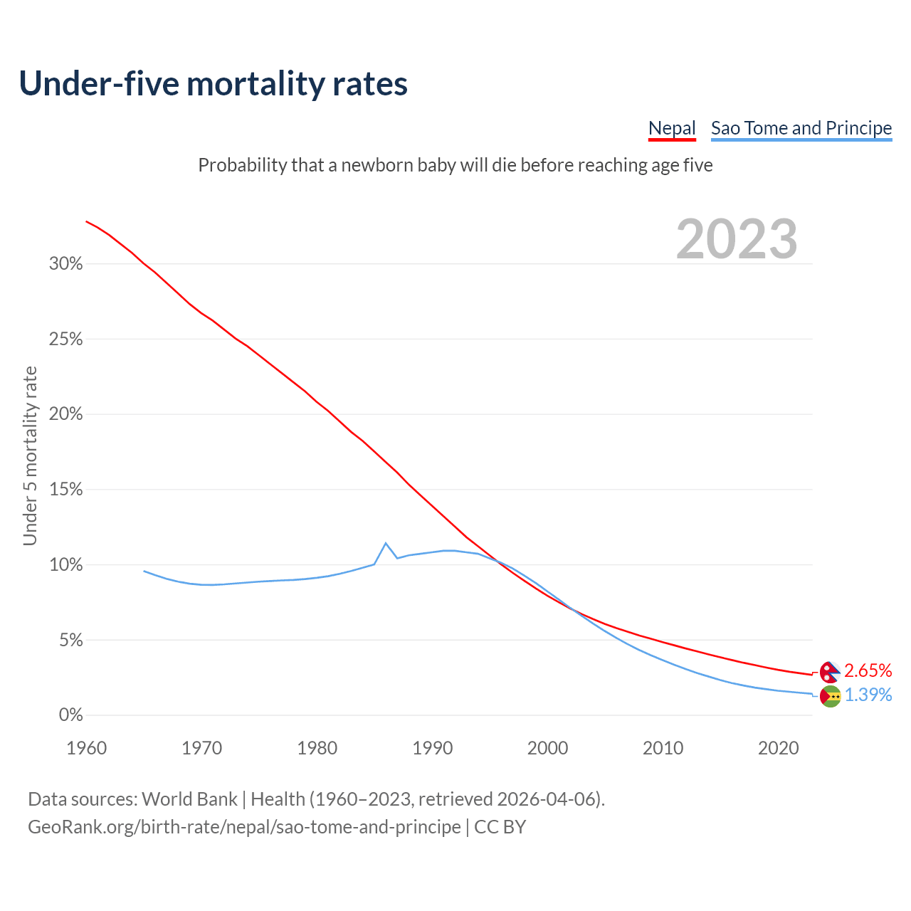 The chance that a newborn baby will die before reaching age five is 2.65% in Nepal and 1.39% in Sao Tome and Principe. Above is a chart with historical data on under-five mortality rates.