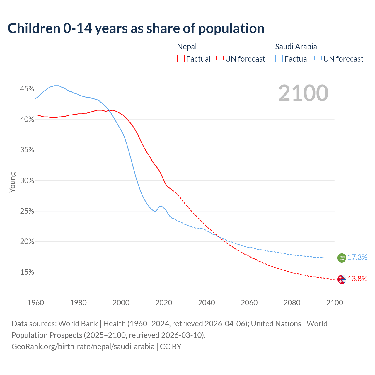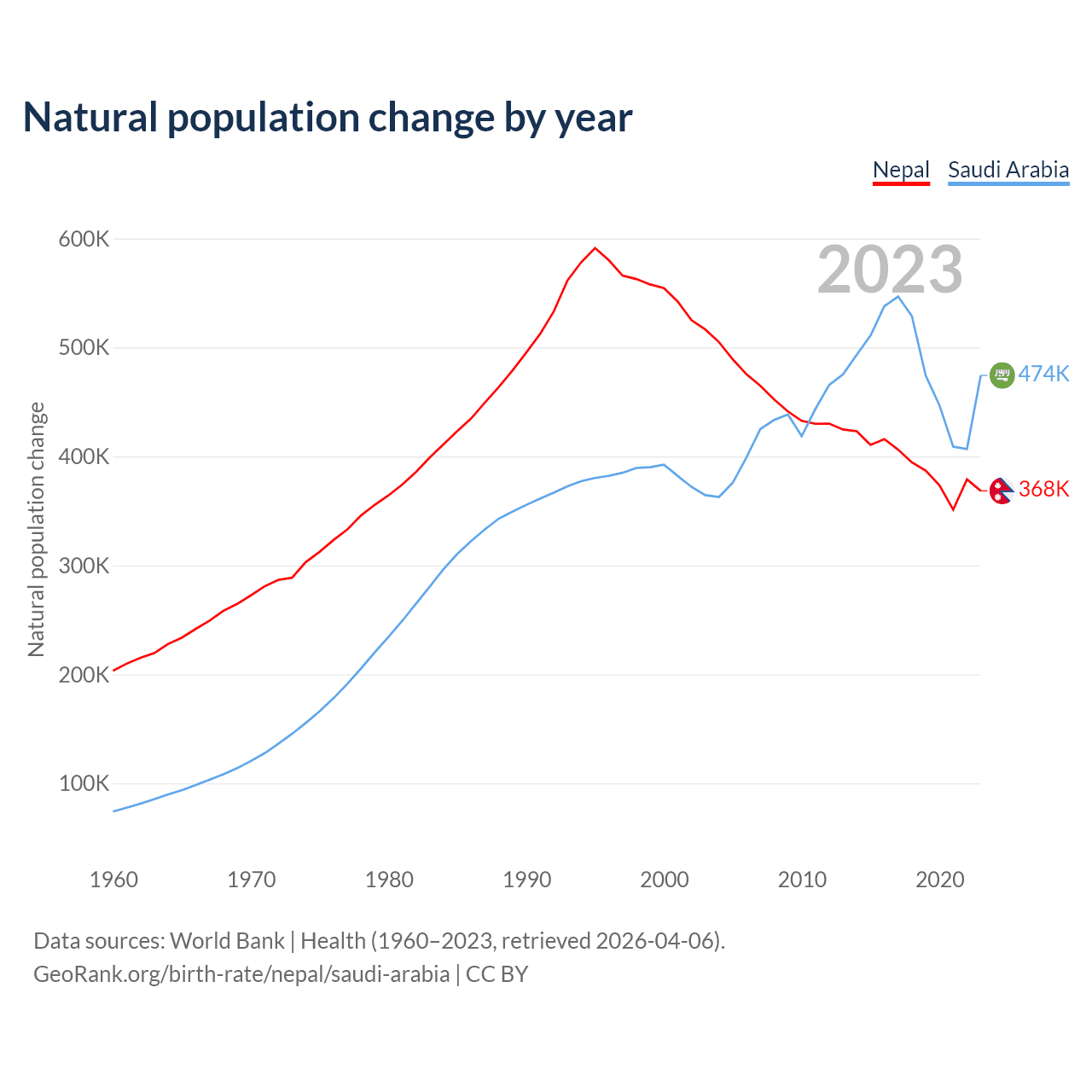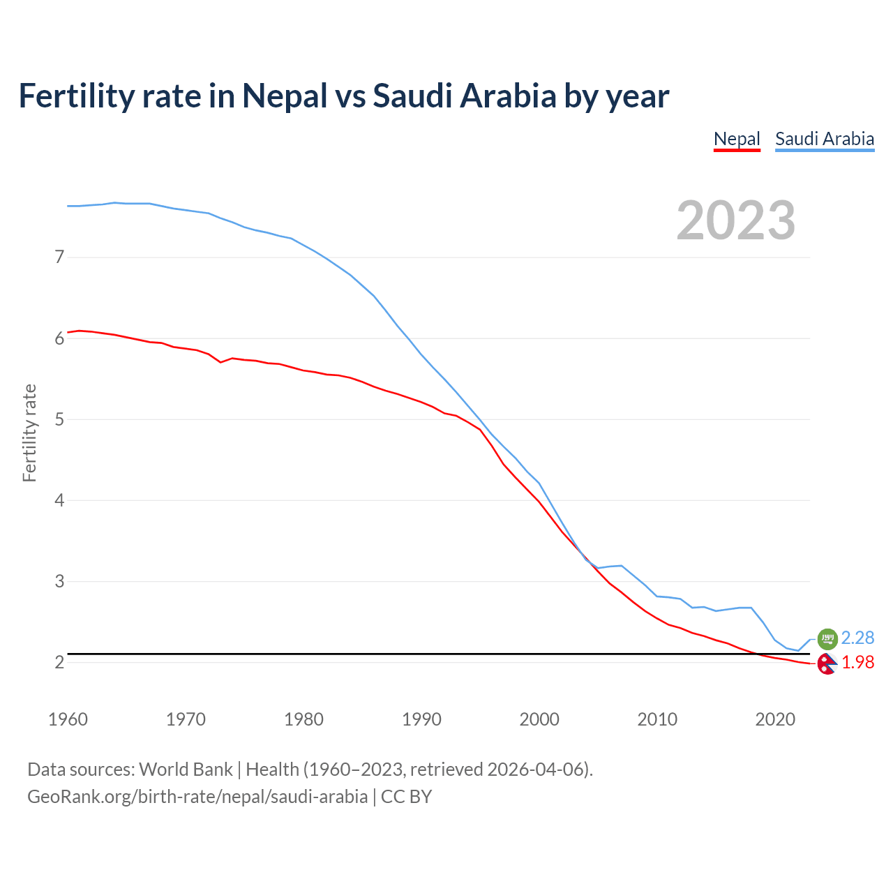 According to the latest available data on birth rates, the fertility rate in Nepal was 1.98 children per woman in 2023, compared to 2.28 in Saudi Arabia in 2023. The replacement level is considered to be 2.1 children per woman.