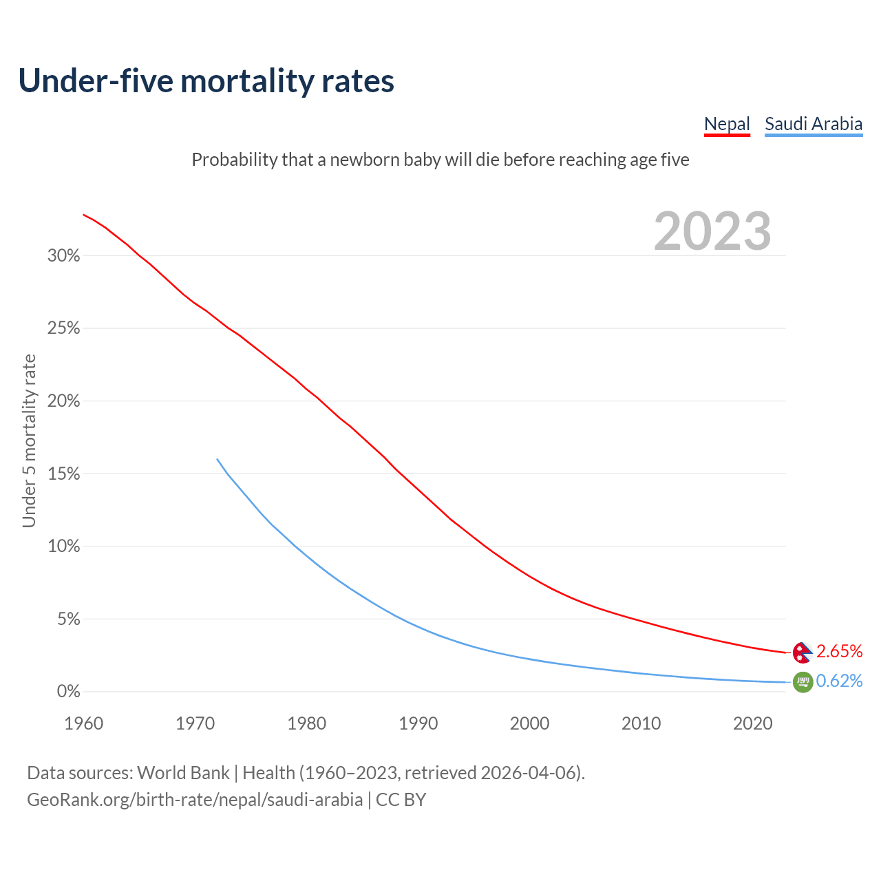 The chance that a newborn baby will die before reaching age five is 2.65% in Nepal and 0.62% in Saudi Arabia. Above is a chart with historical data on under-five mortality rates.