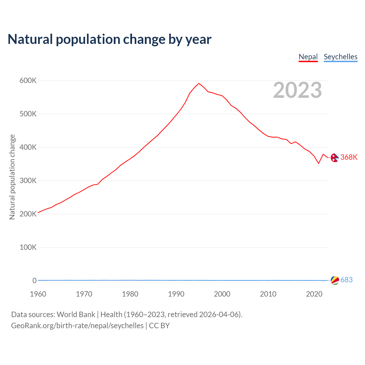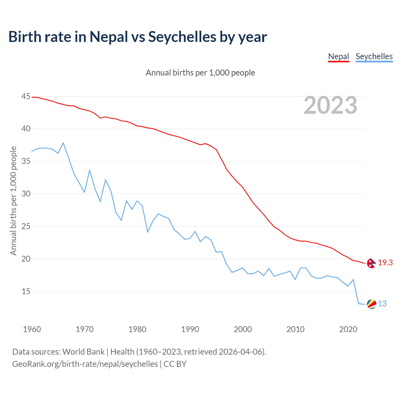 Nepal has an annual birth rate of 19.3 births per 1,000 people, compared to 13 for the Seychelles. The average number of children a woman is expected to have during her lifetime — the fertility rate, is 1.98 in Nepal and 2.02 in the Seychelles — 1.81% difference.