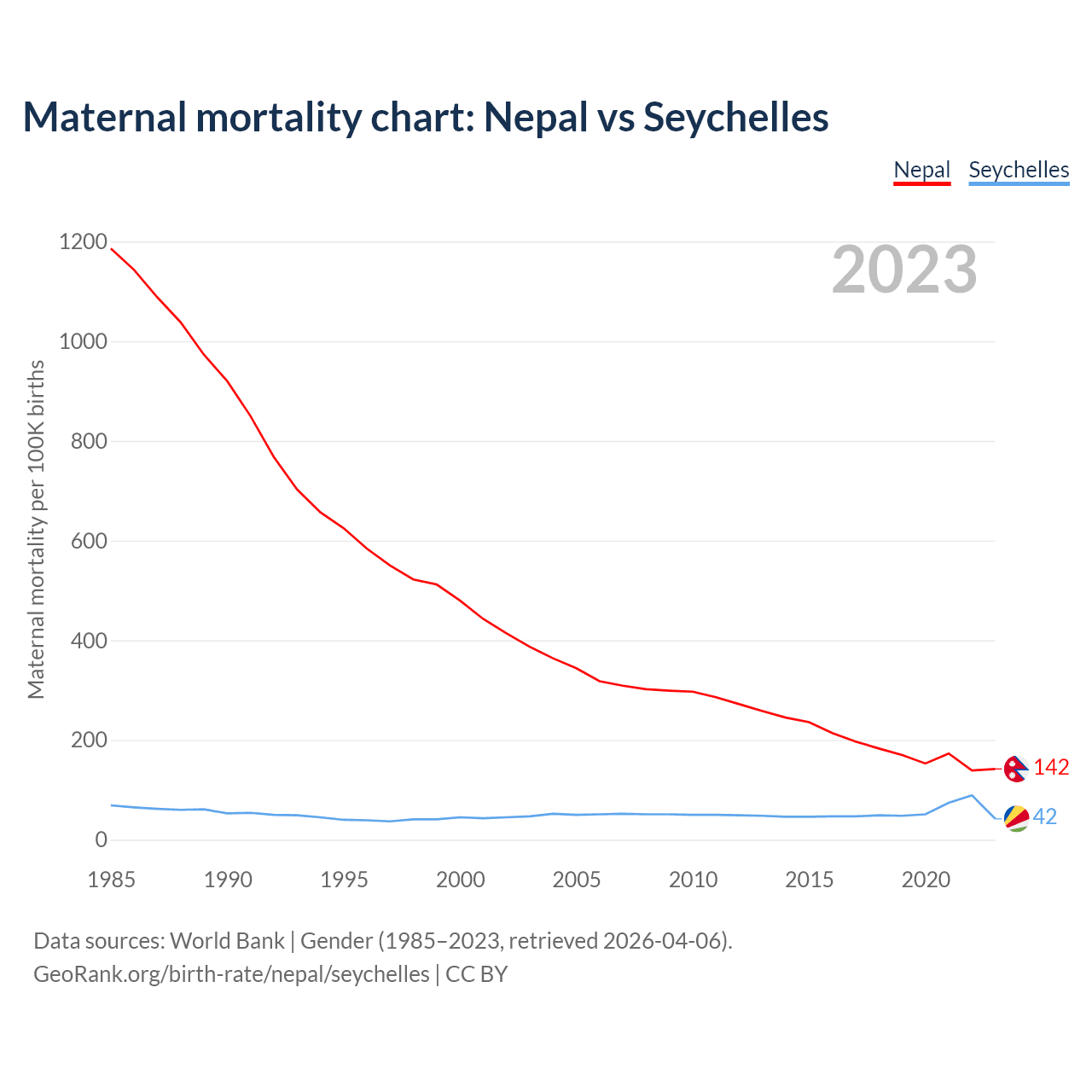 The maternal mortality rate, which is the probability of dying during childbirth or within 42 days of pregnancy termination, is 142 deaths per 100,000 live births in Nepal, compared to 42 deaths in the Seychelles.