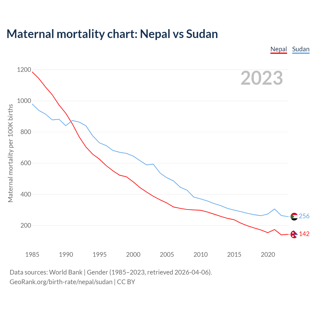 The maternal mortality rate, which is the probability of dying during childbirth or within 42 days of pregnancy termination, is 142 deaths per 100,000 live births in Nepal, compared to 256 deaths in Sudan.