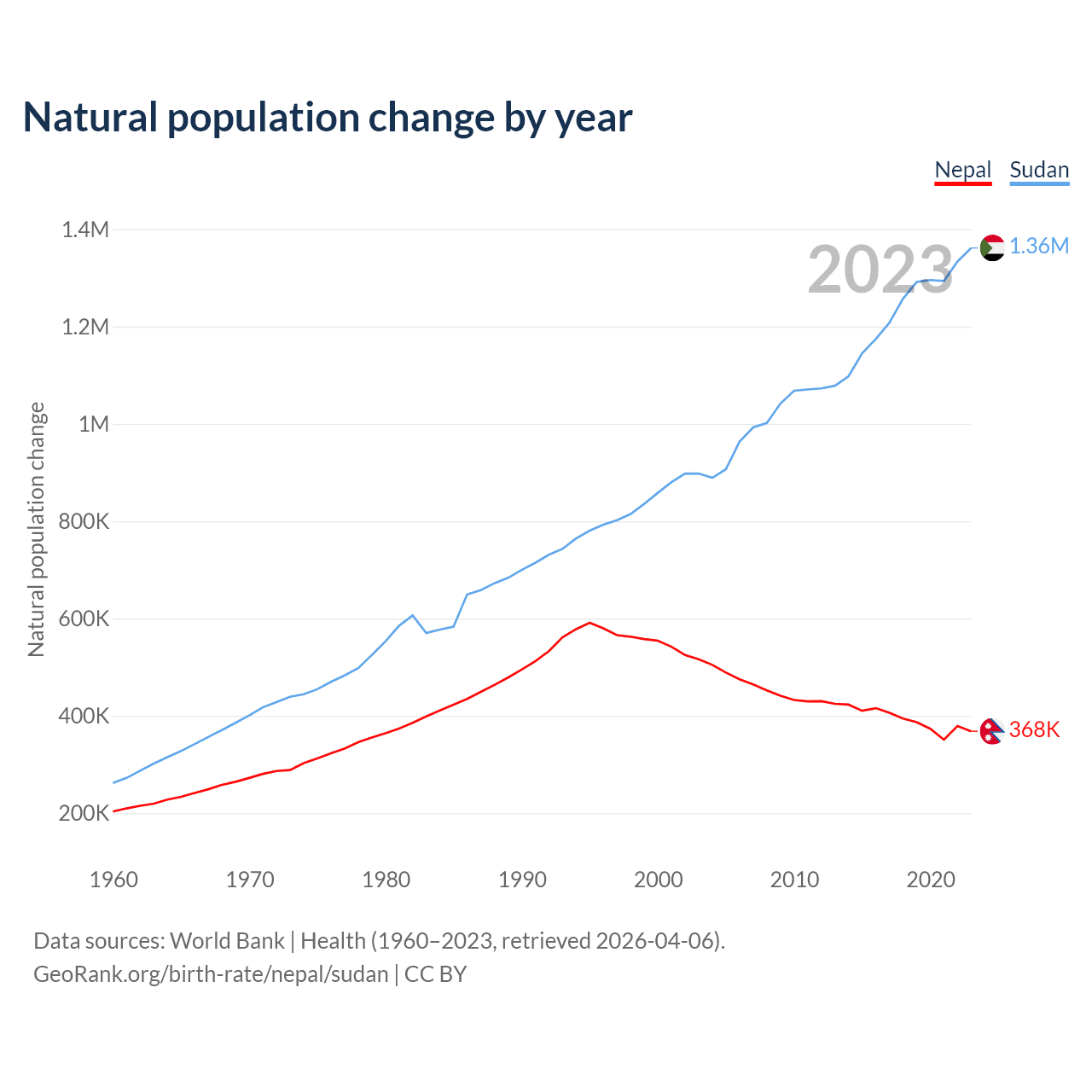 Nepal has an annual birth rate of 19.3 births per 1,000 people, compared to 33.6 for Sudan. The average number of children a woman is expected to have during her lifetime — the fertility rate, is 1.98 in Nepal and 4.32 in Sudan — 117.9% difference.