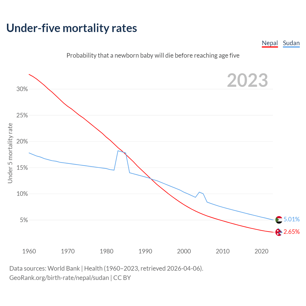 The chance that a newborn baby will die before reaching age five is 2.65% in Nepal and 5.01% in Sudan. Above is a chart with historical data on under-five mortality rates.