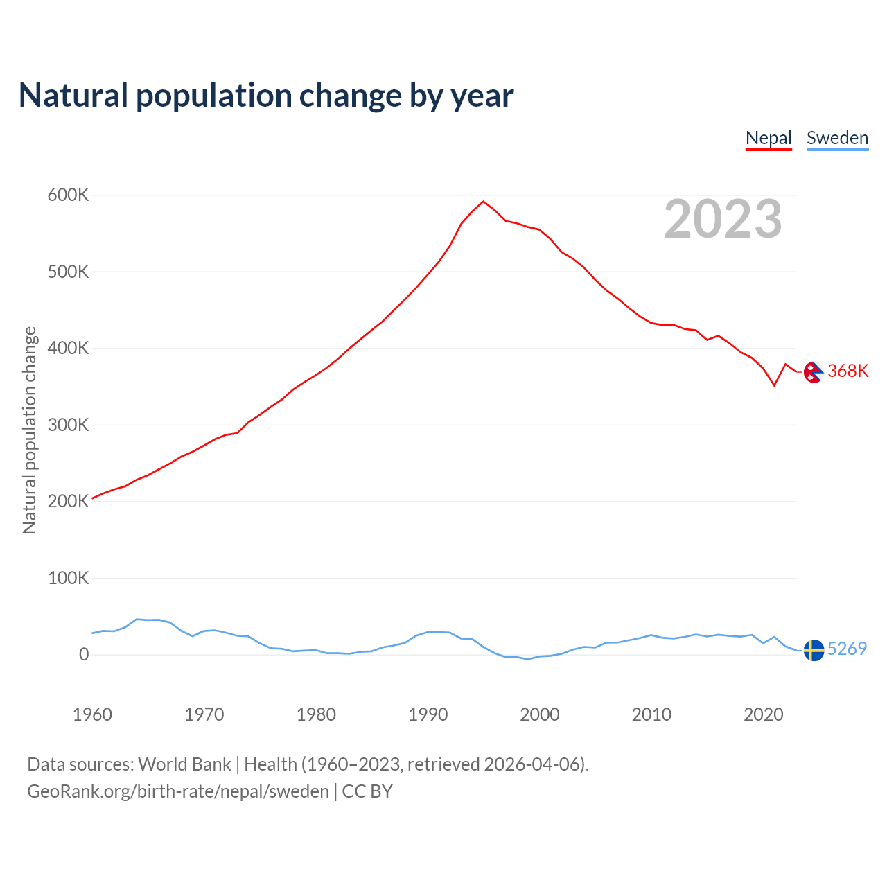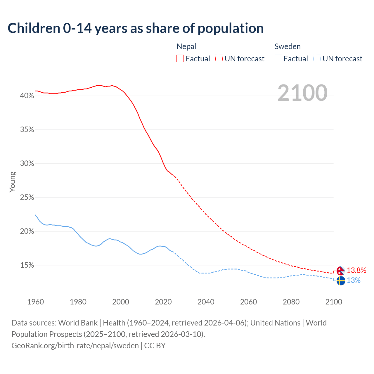 According to the latest available data on birth rates, the fertility rate in Nepal was 1.98 children per woman in 2023, compared to 1.45 in Sweden in 2023. The replacement level is considered to be 2.1 children per woman.