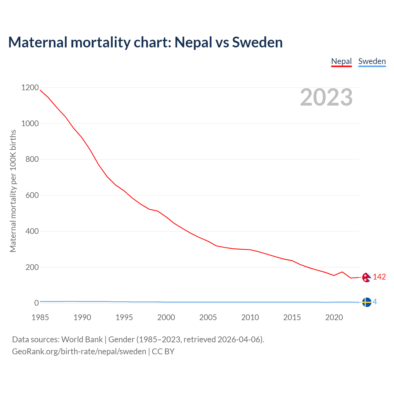 The maternal mortality rate, which is the probability of dying during childbirth or within 42 days of pregnancy termination, is 142 deaths per 100,000 live births in Nepal, compared to 4 deaths in Sweden.