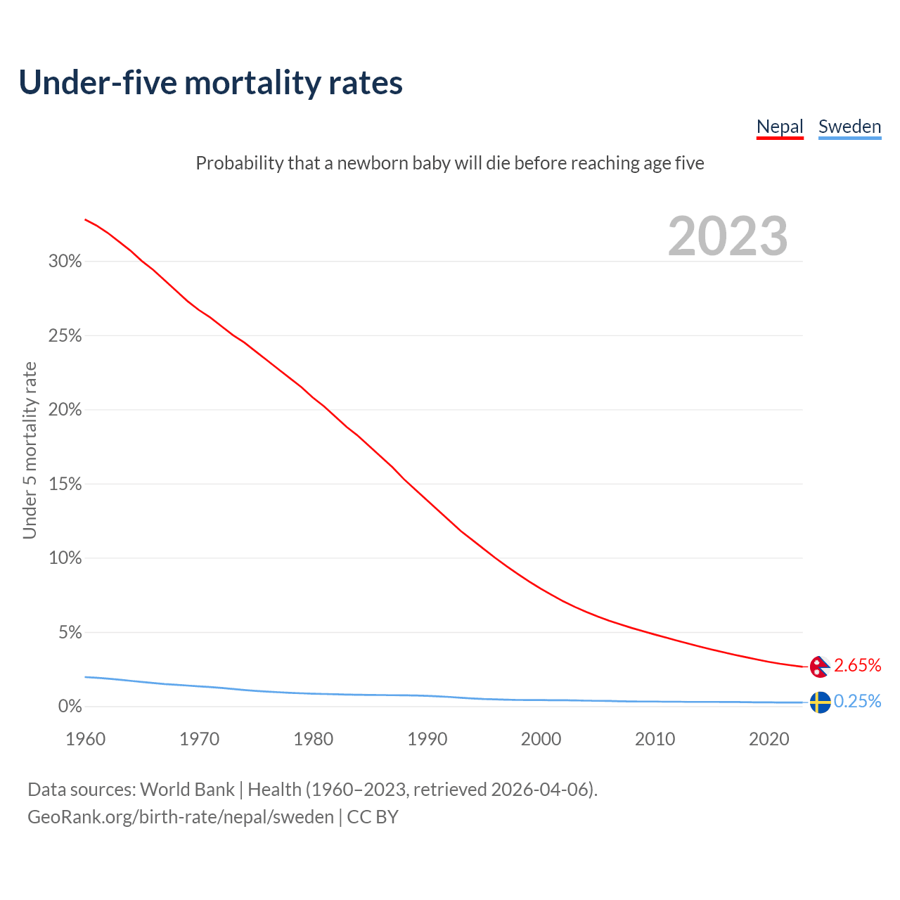 The chance that a newborn baby will die before reaching age five is 2.65% in Nepal and 0.25% in Sweden. Above is a chart with historical data on under-five mortality rates.