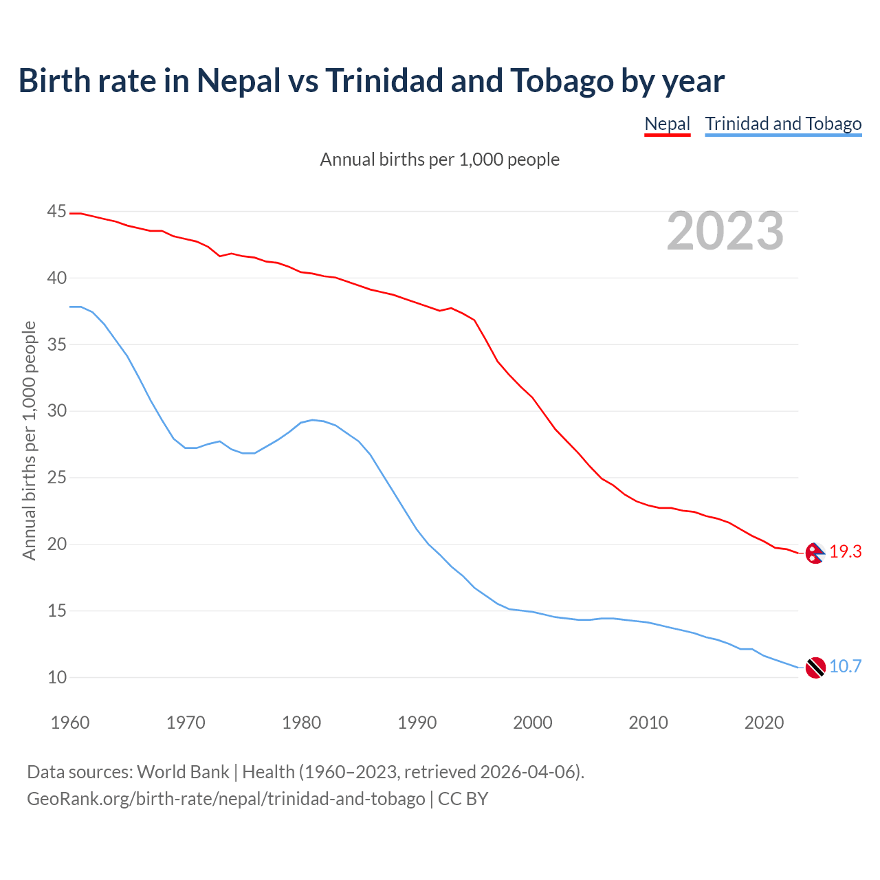 Nepal has an annual birth rate of 19.3 births per 1,000 people, compared to 10.7 for Trinidad and Tobago. The average number of children a woman is expected to have during her lifetime — the fertility rate, is 1.98 in Nepal and 1.53 in Trinidad and Tobago — 22.8% difference.