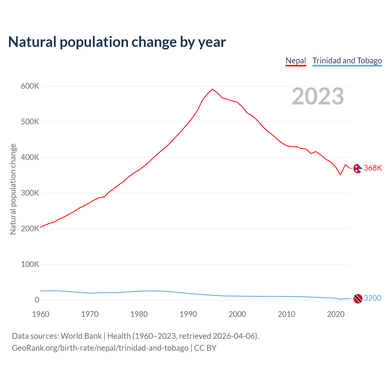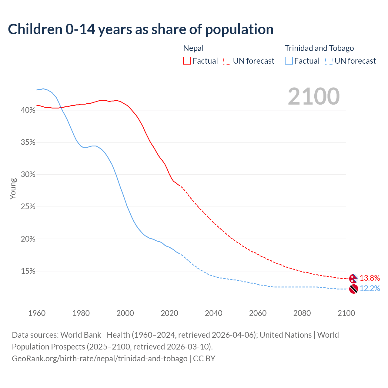 According to the latest available data on birth rates, the fertility rate in Nepal was 1.98 children per woman in 2023, compared to 1.53 in Trinidad and Tobago in 2023. The replacement level is considered to be 2.1 children per woman.