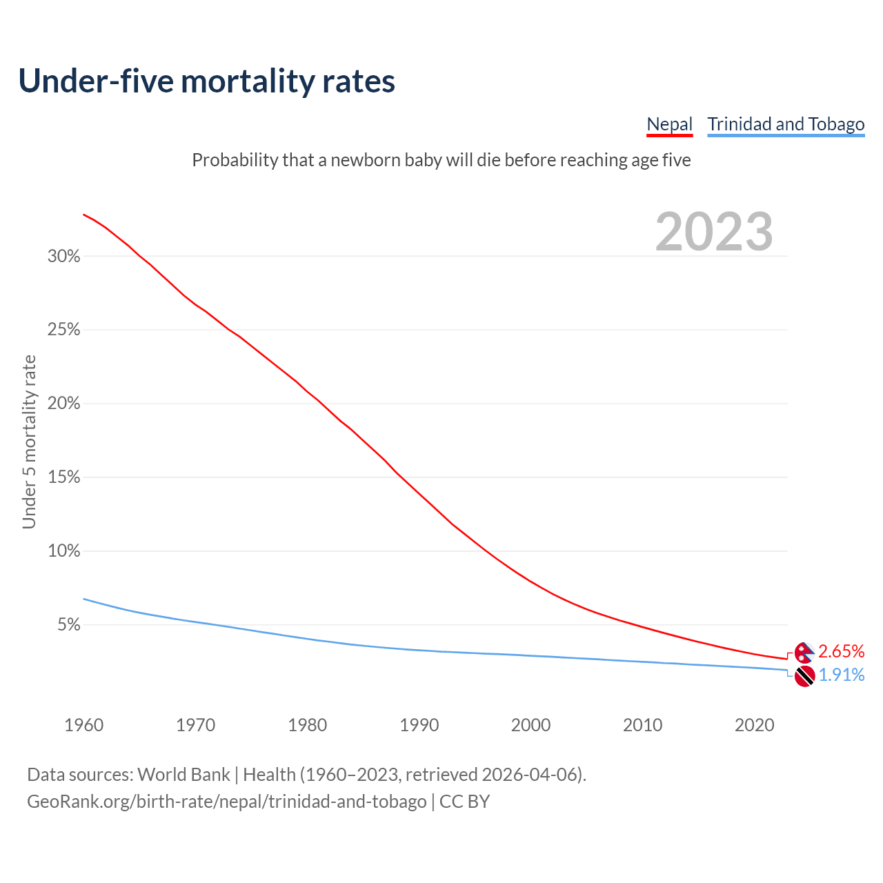 The chance that a newborn baby will die before reaching age five is 2.65% in Nepal and 1.91% in Trinidad and Tobago. Above is a chart with historical data on under-five mortality rates.