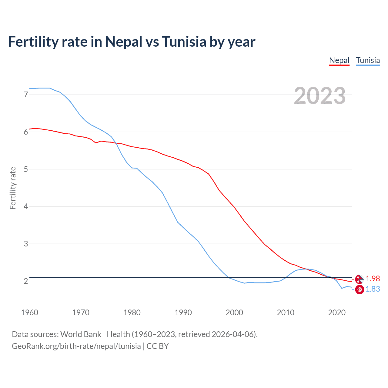 According to the latest available data on birth rates, the fertility rate in Nepal was 1.98 children per woman in 2023, compared to 1.83 in Tunisia in 2023. The replacement level is considered to be 2.1 children per woman.
