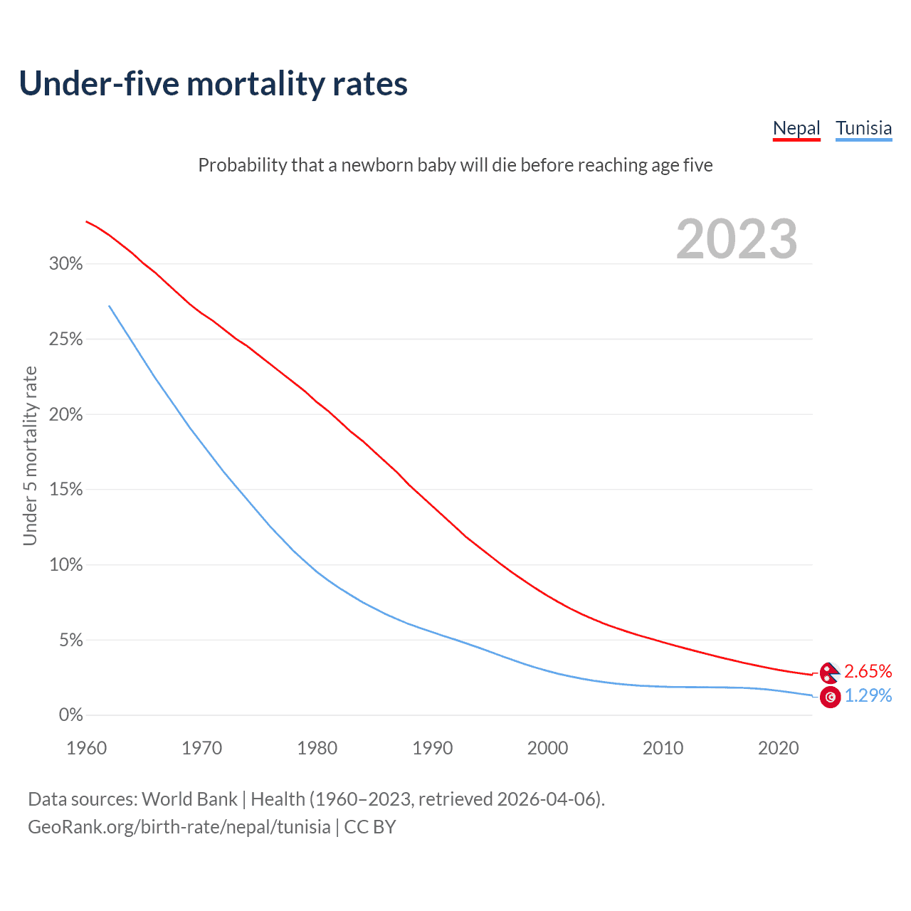 The chance that a newborn baby will die before reaching age five is 2.65% in Nepal and 1.29% in Tunisia. Above is a chart with historical data on under-five mortality rates.
