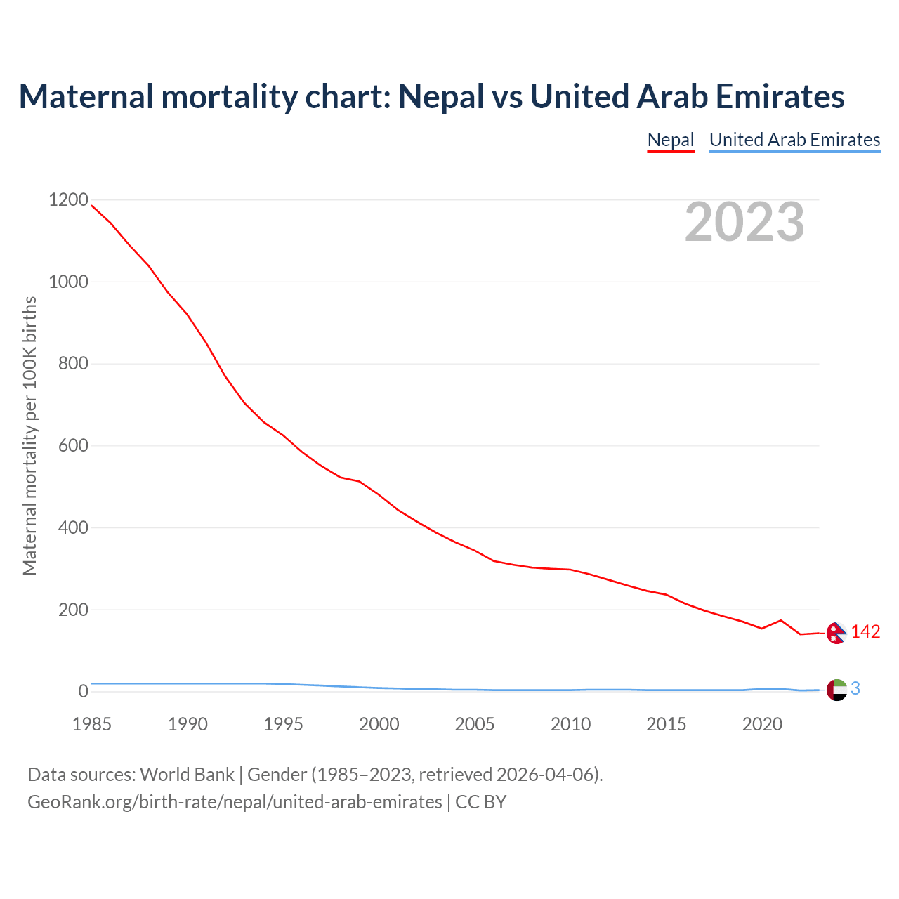 The maternal mortality rate, which is the probability of dying during childbirth or within 42 days of pregnancy termination, is 142 deaths per 100,000 live births in Nepal, compared to 3 deaths in the United Arab Emirates.
