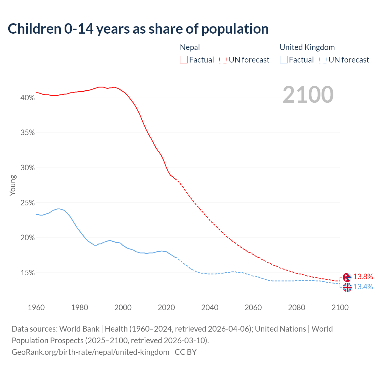 According to the latest available data on birth rates, the fertility rate in Nepal was 1.98 children per woman in 2023, compared to 1.56 in the United Kingdom in 2023. The replacement level is considered to be 2.1 children per woman.