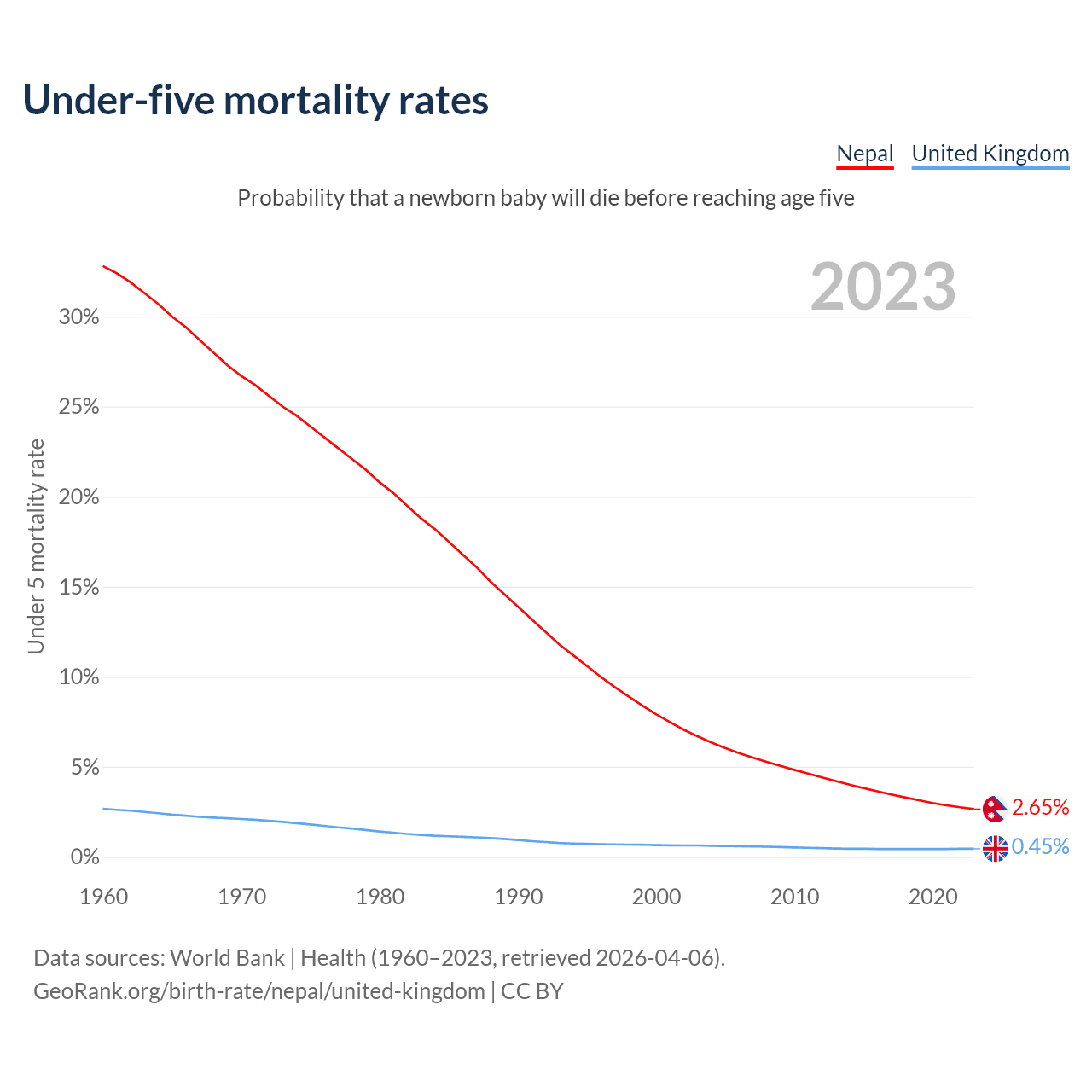 The chance that a newborn baby will die before reaching age five is 2.65% in Nepal and 0.45% in the United Kingdom. Above is a chart with historical data on under-five mortality rates.