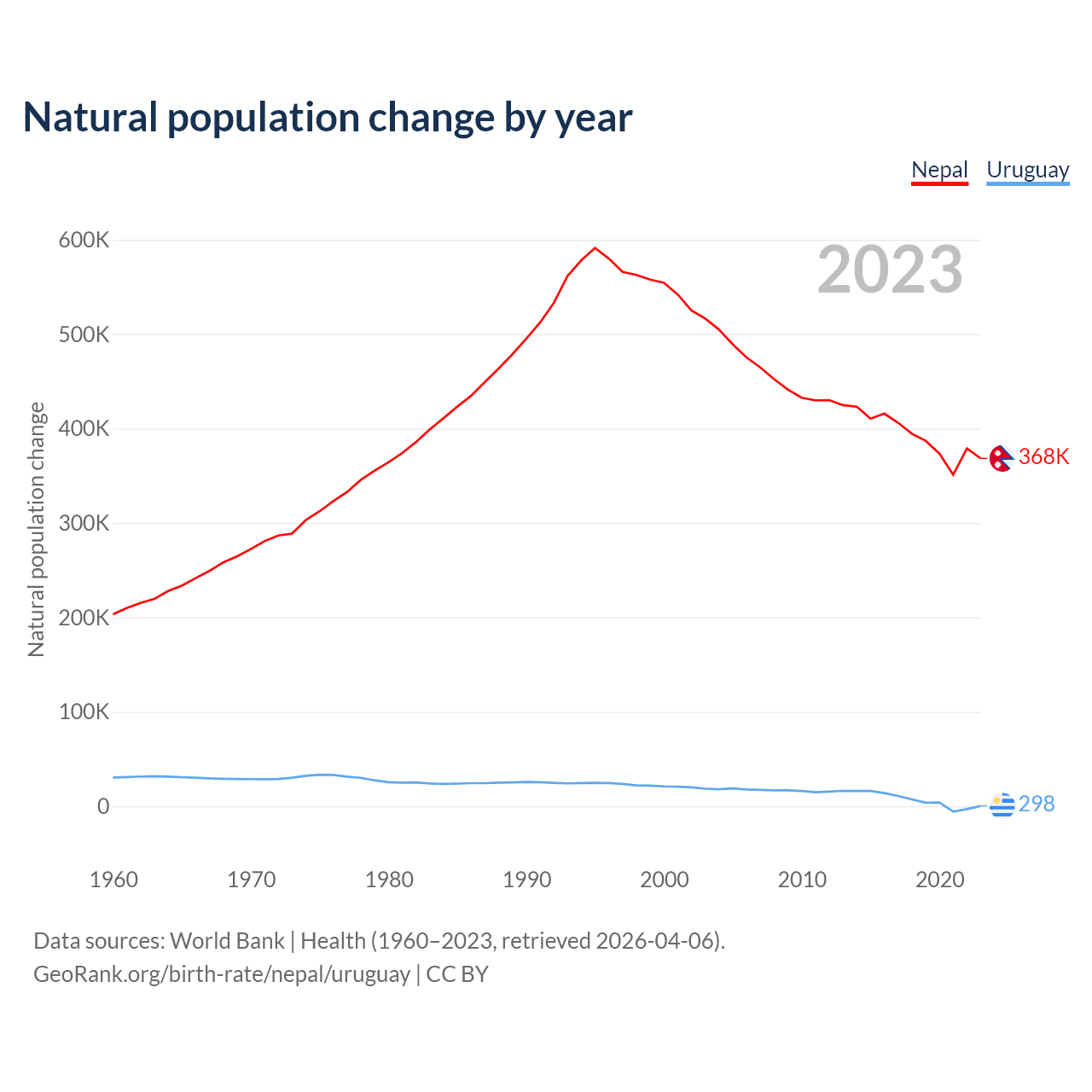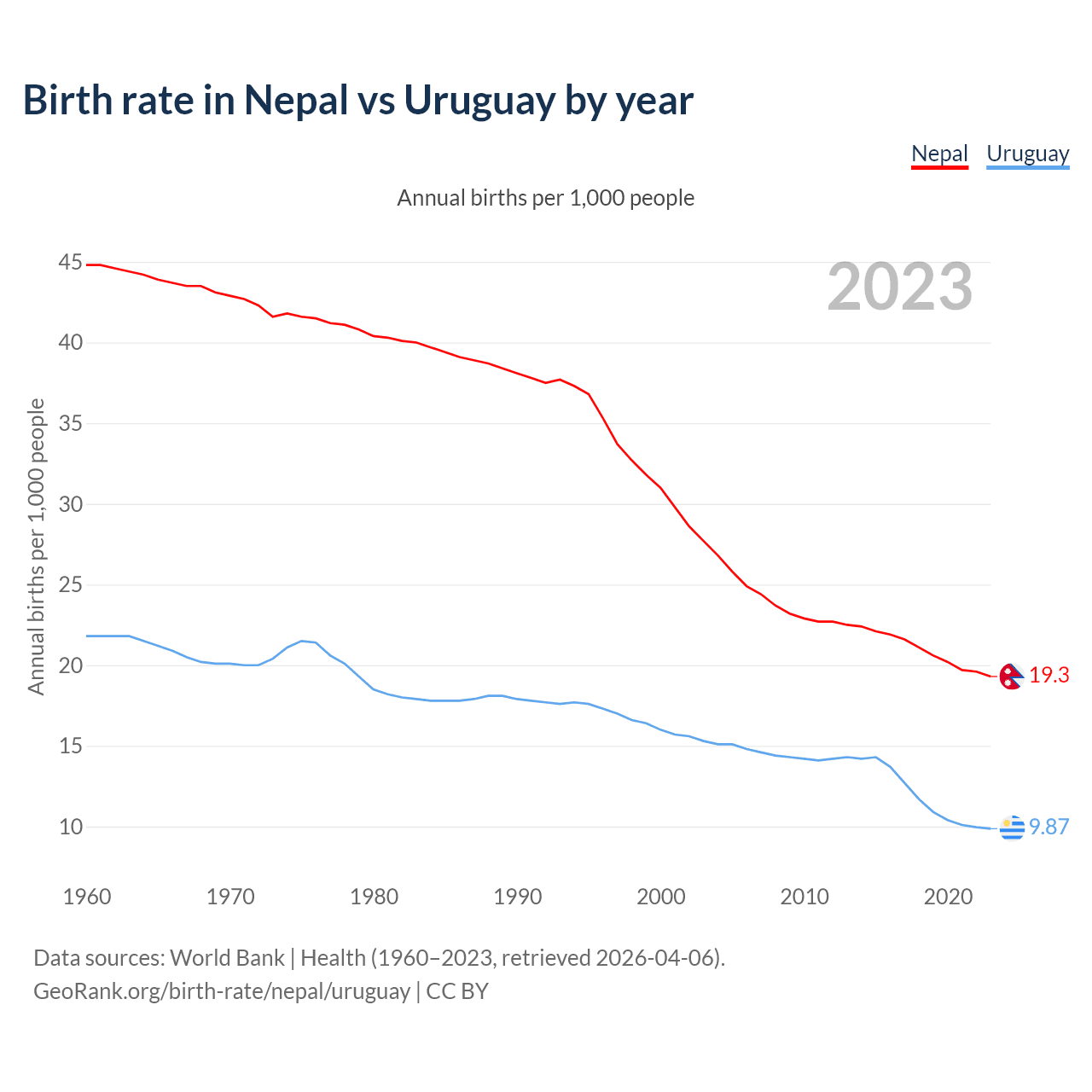 Nepal has an annual birth rate of 19.3 births per 1,000 people, compared to 9.87 for Uruguay. The average number of children a woman is expected to have during her lifetime — the fertility rate, is 1.98 in Nepal and 1.41 in Uruguay — 29% difference.