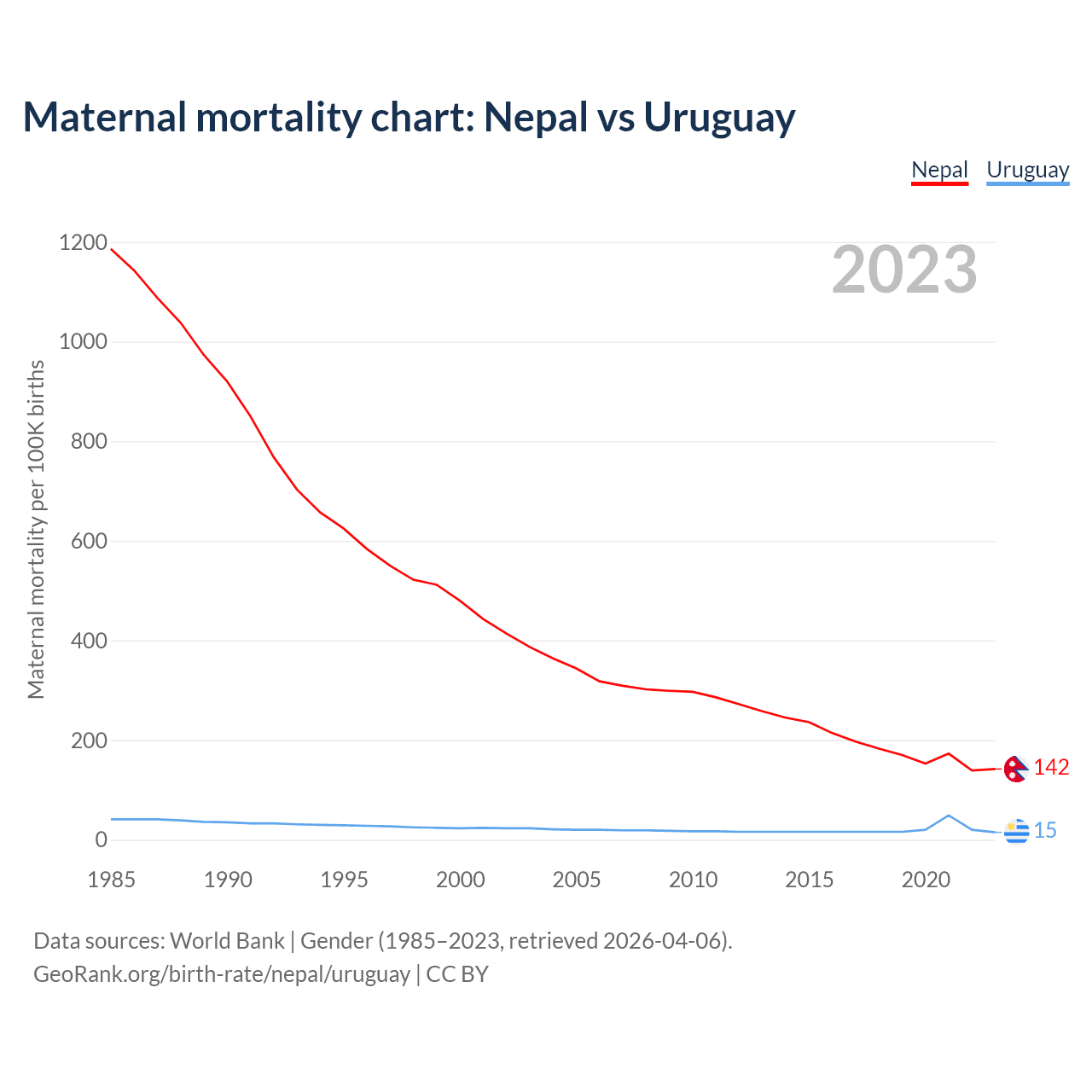The maternal mortality rate, which is the probability of dying during childbirth or within 42 days of pregnancy termination, is 142 deaths per 100,000 live births in Nepal, compared to 15 deaths in Uruguay.