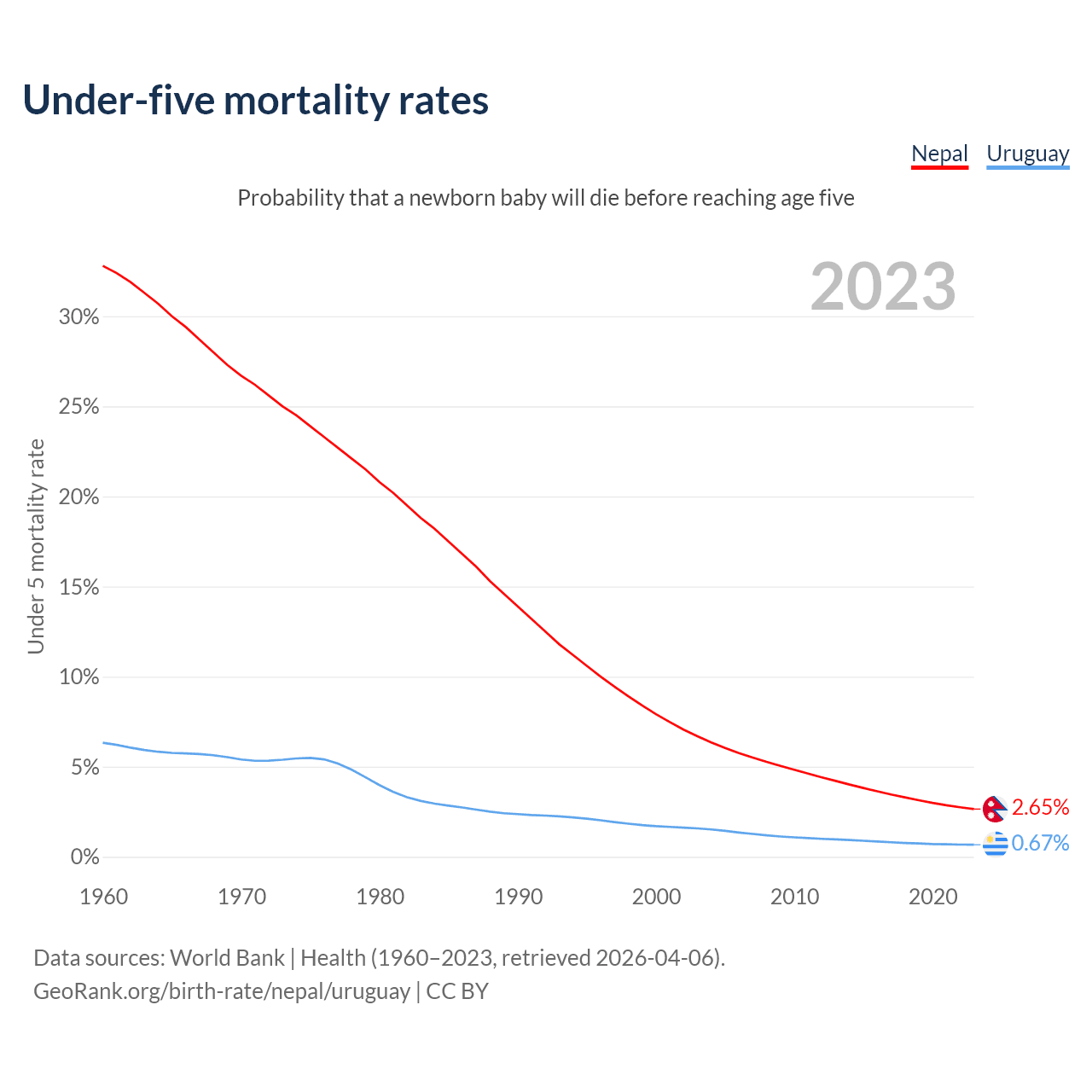 The chance that a newborn baby will die before reaching age five is 2.65% in Nepal and 0.67% in Uruguay. Above is a chart with historical data on under-five mortality rates.