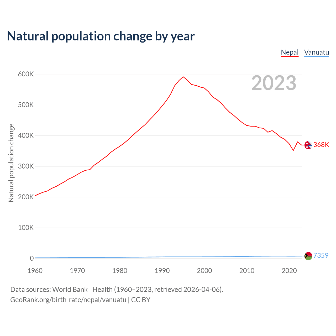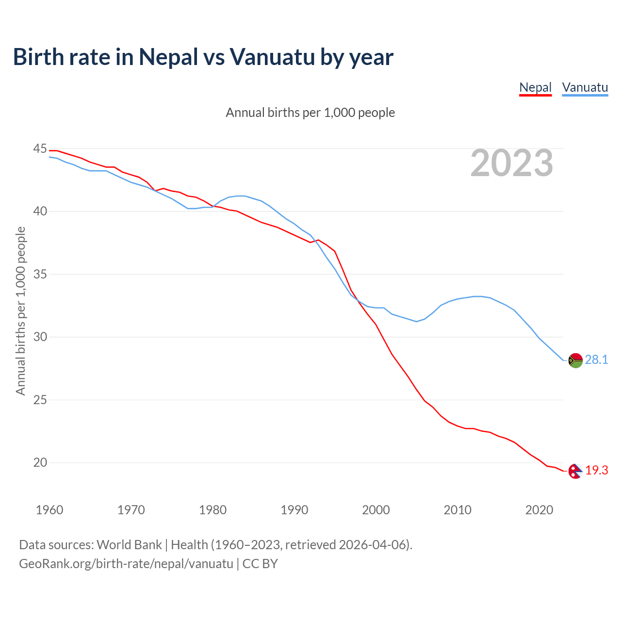 Nepal has an annual birth rate of 19.3 births per 1,000 people, compared to 28.1 for Vanuatu. The average number of children a woman is expected to have during her lifetime — the fertility rate, is 1.98 in Nepal and 3.6 in Vanuatu — 81.3% difference.