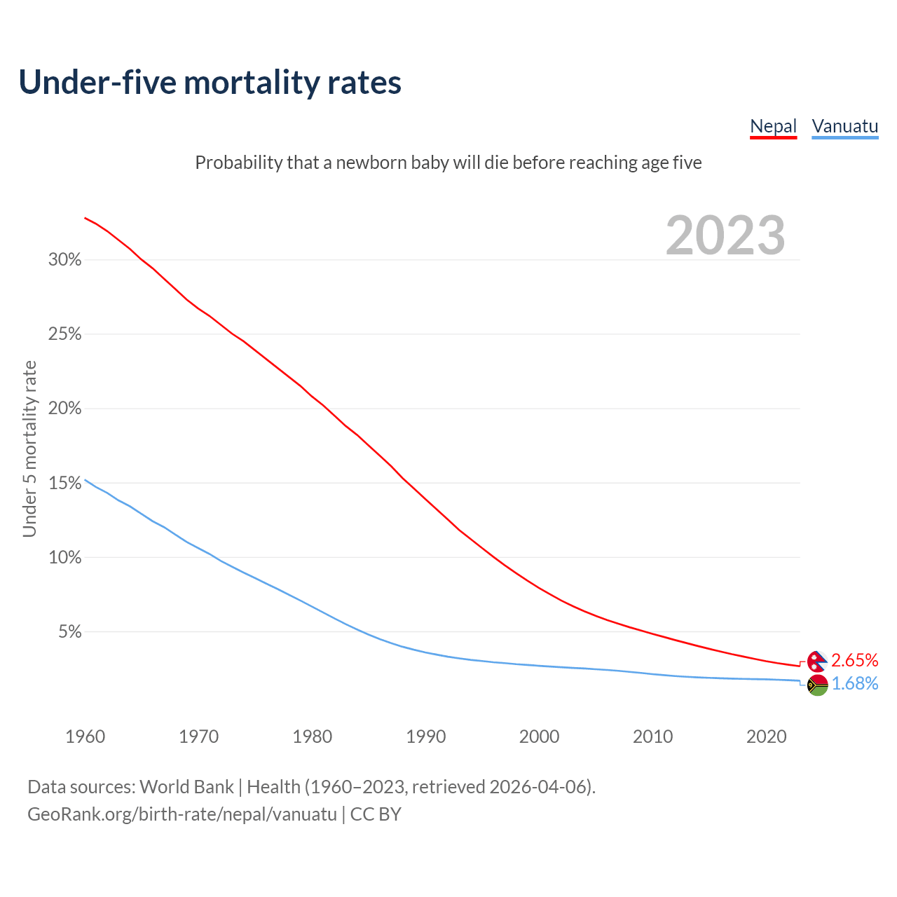 The chance that a newborn baby will die before reaching age five is 2.65% in Nepal and 1.68% in Vanuatu. Above is a chart with historical data on under-five mortality rates.
