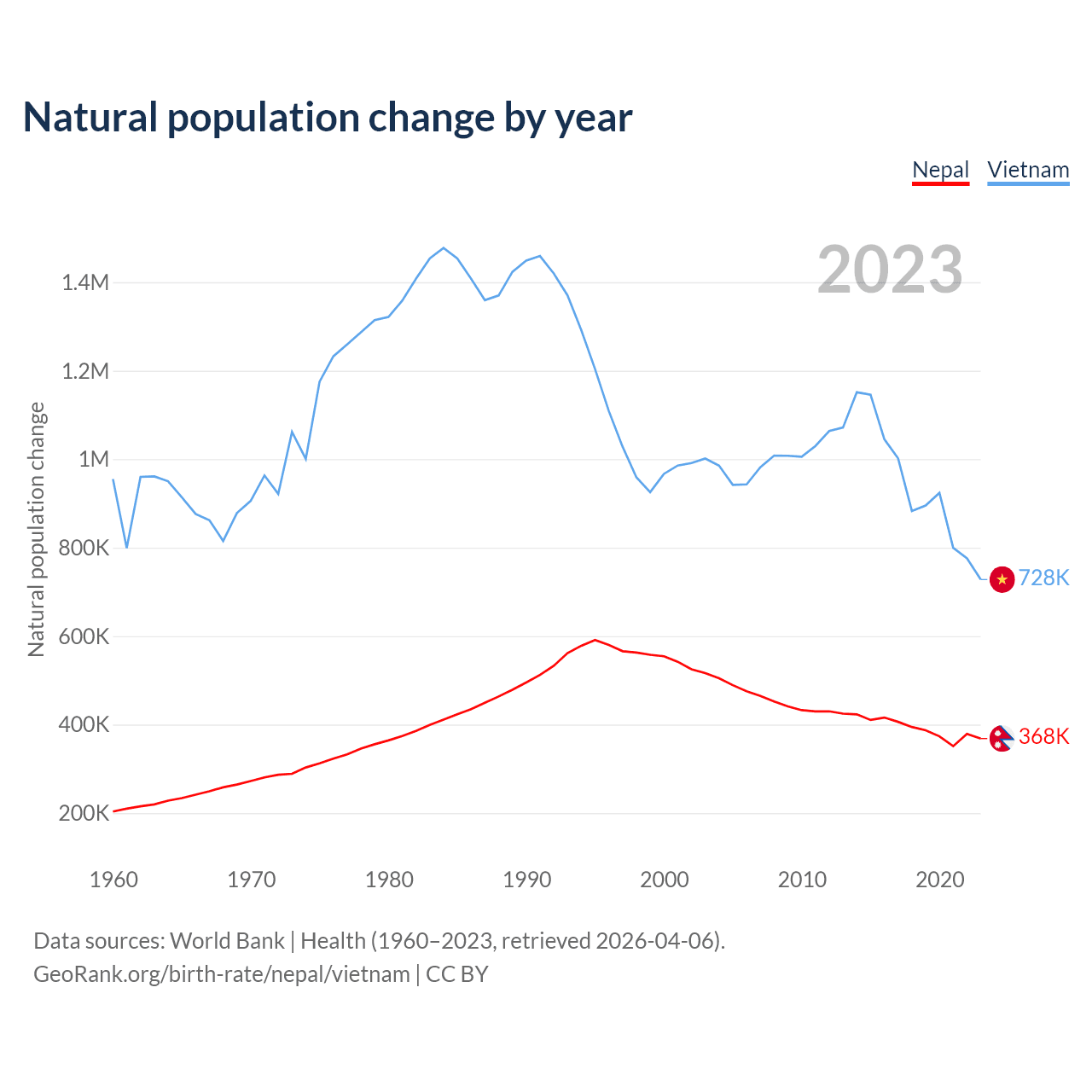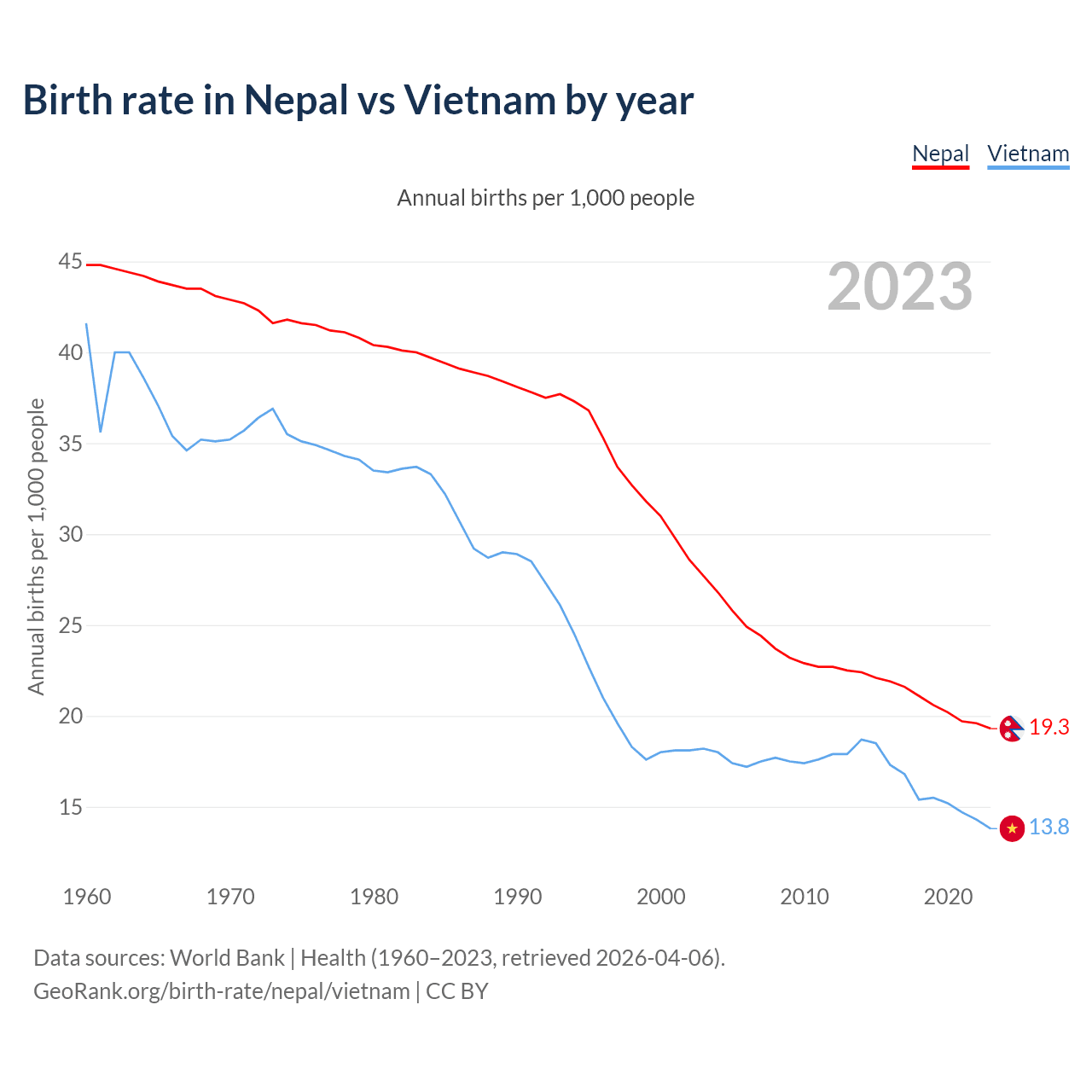 According to the latest available data on birth rates, the fertility rate in Nepal was 1.98 children per woman in 2023, compared to 1.91 in Vietnam in 2023. The replacement level is considered to be 2.1 children per woman.