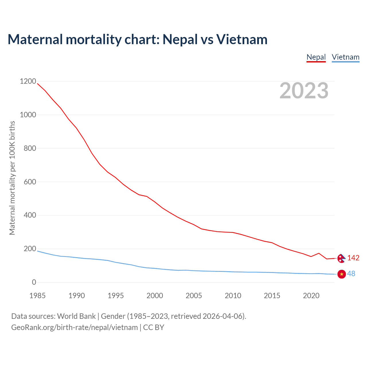The maternal mortality rate, which is the probability of dying during childbirth or within 42 days of pregnancy termination, is 142 deaths per 100,000 live births in Nepal, compared to 48 deaths in Vietnam.