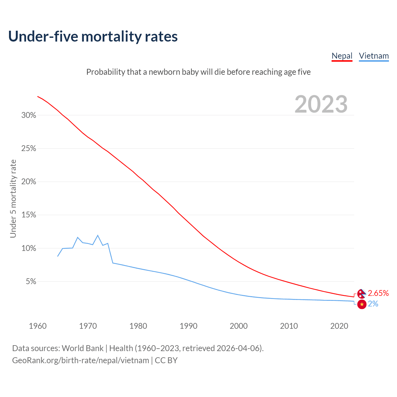 The chance that a newborn baby will die before reaching age five is 2.65% in Nepal and 2% in Vietnam. Above is a chart with historical data on under-five mortality rates.