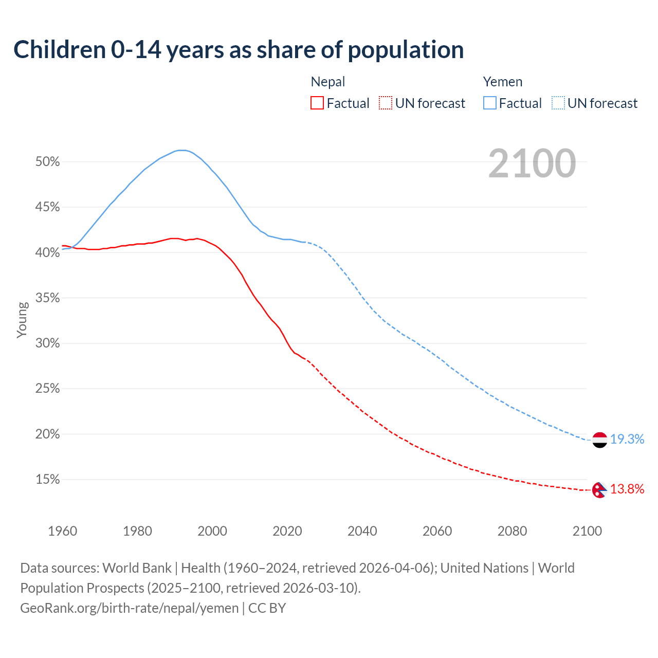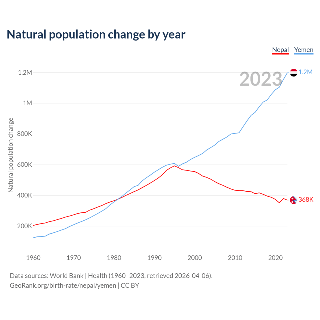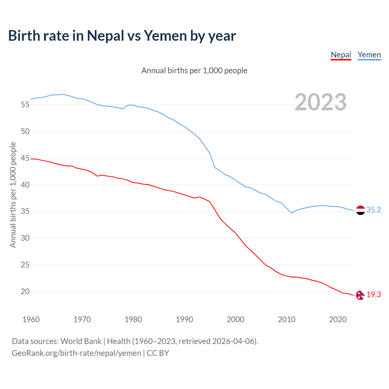 Nepal has an annual birth rate of 19.3 births per 1,000 people, compared to 35.2 for Yemen. The average number of children a woman is expected to have during her lifetime — the fertility rate, is 1.98 in Nepal and 4.59 in Yemen — 131.4% difference.
