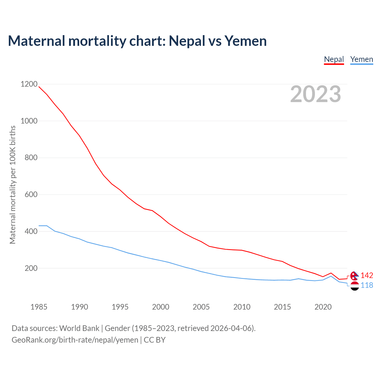 The maternal mortality rate, which is the probability of dying during childbirth or within 42 days of pregnancy termination, is 142 deaths per 100,000 live births in Nepal, compared to 118 deaths in Yemen.