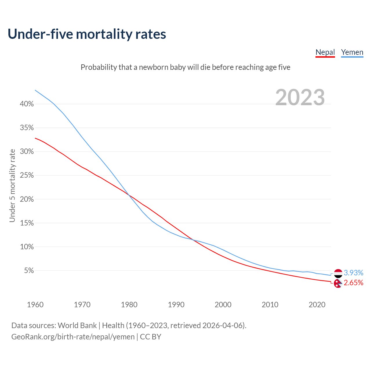The chance that a newborn baby will die before reaching age five is 2.65% in Nepal and 3.93% in Yemen. Above is a chart with historical data on under-five mortality rates.