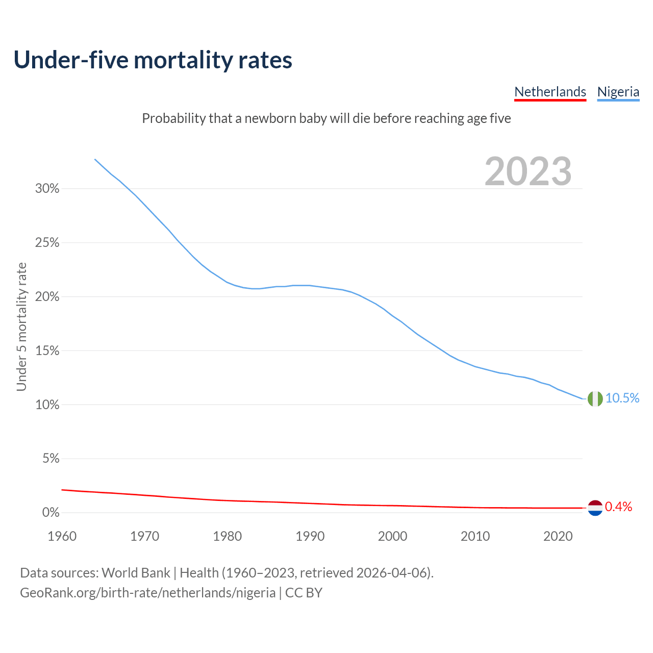 The chance that a newborn baby will die before reaching age five is 0.4% in the Netherlands and 10.5% in Nigeria. Above is a chart with historical data on under-five mortality rates.