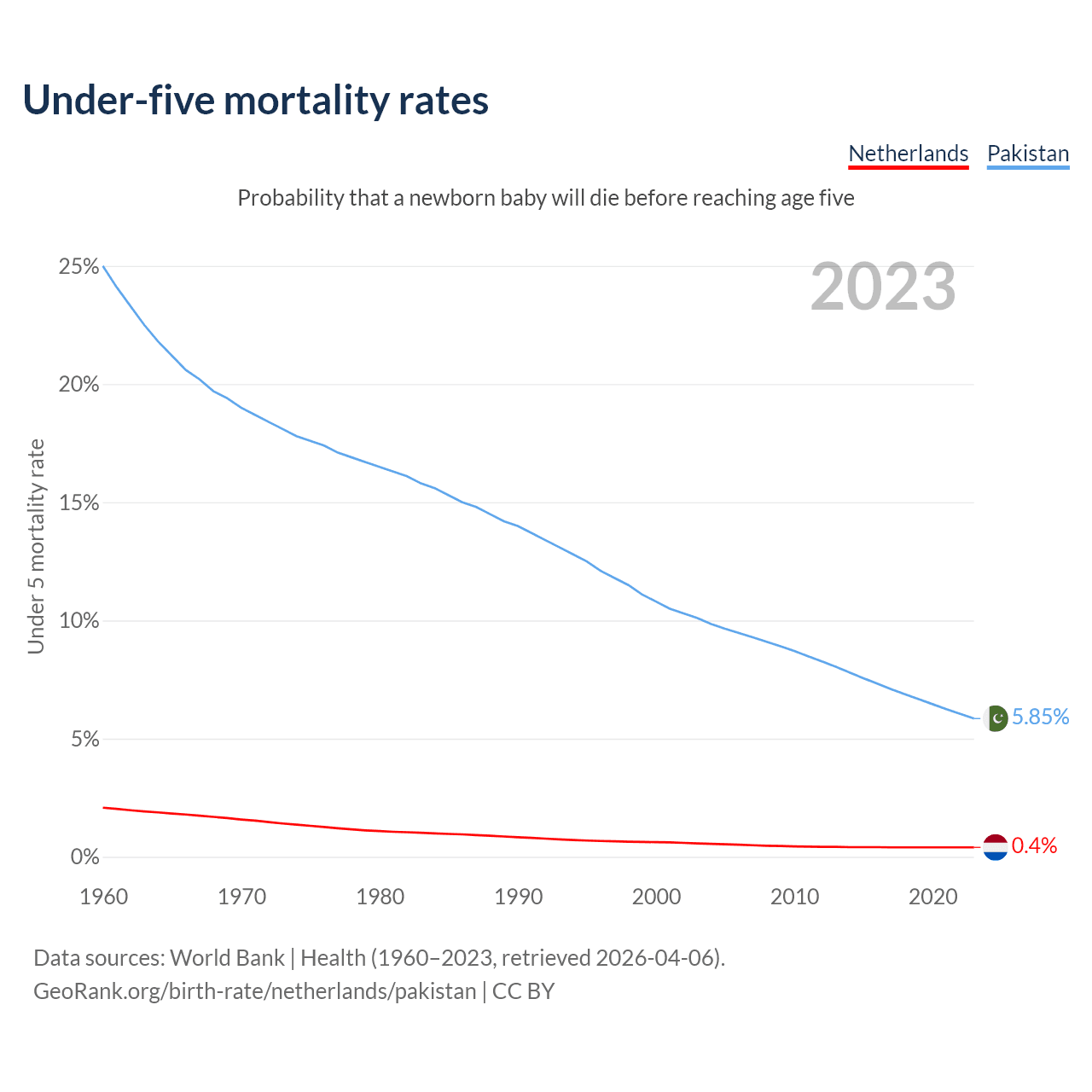 The chance that a newborn baby will die before reaching age five is 0.4% in the Netherlands and 5.85% in Pakistan. Above is a chart with historical data on under-five mortality rates.