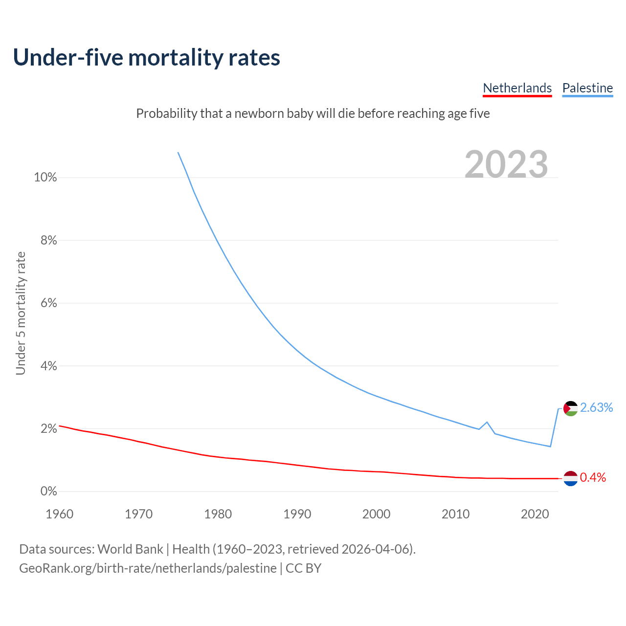 The chance that a newborn baby will die before reaching age five is 0.4% in the Netherlands and 2.63% in Palestine. Above is a chart with historical data on under-five mortality rates.
