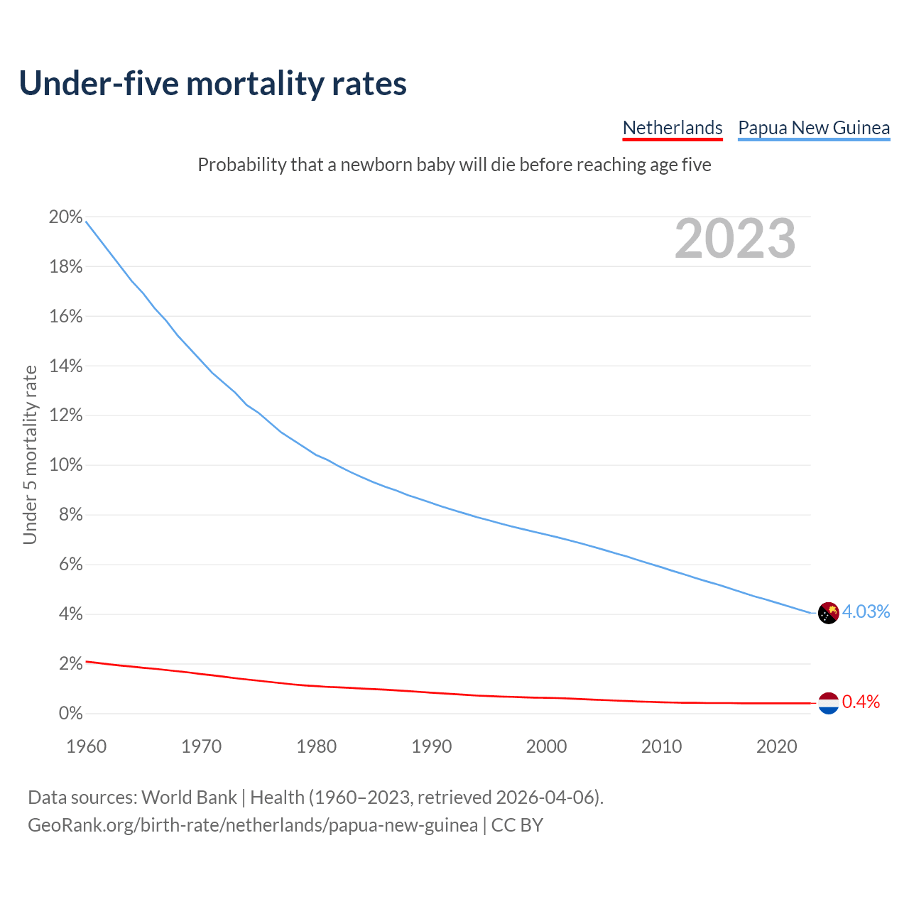 The chance that a newborn baby will die before reaching age five is 0.4% in the Netherlands and 4.03% in Papua New Guinea. Above is a chart with historical data on under-five mortality rates.
