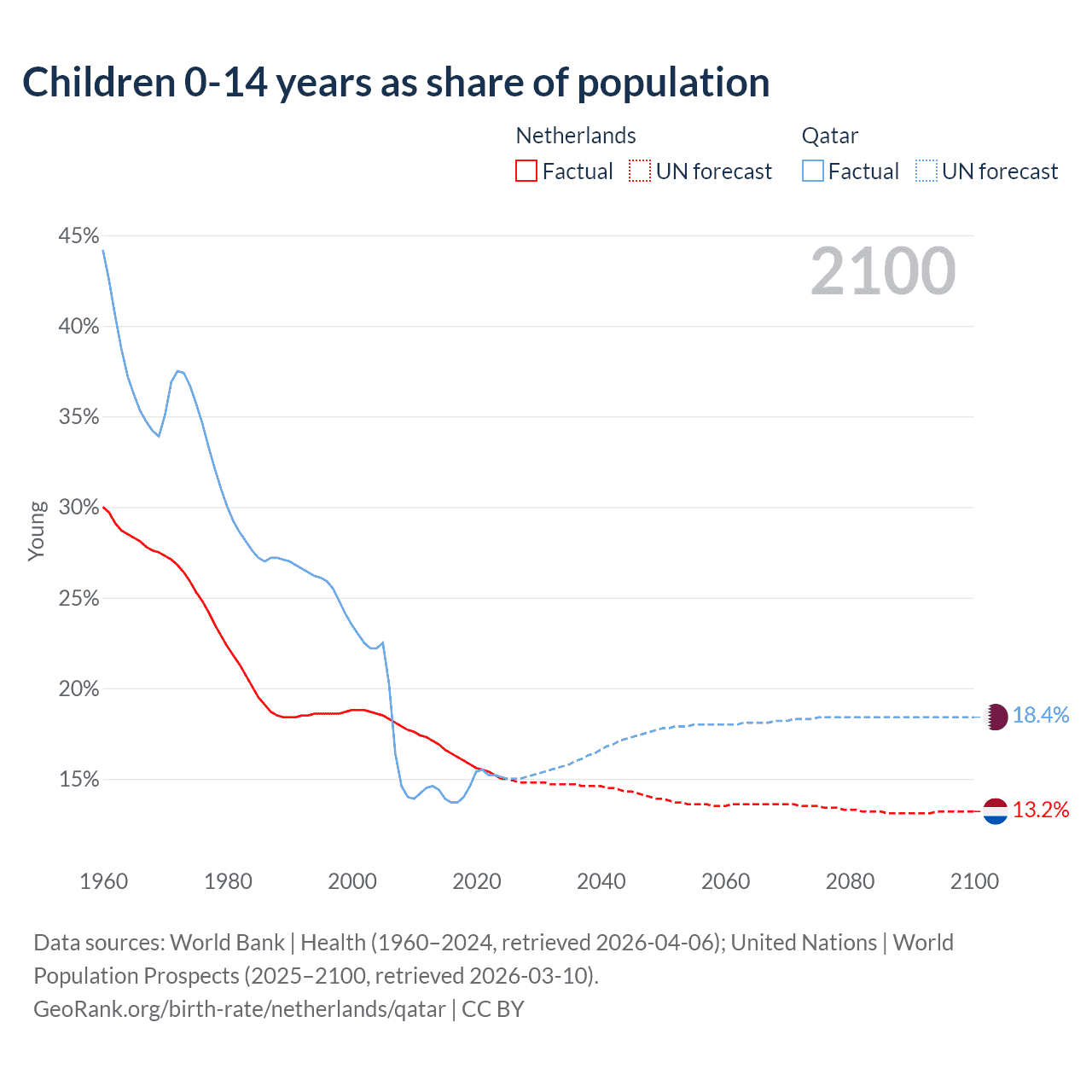 According to the latest available data on birth rates, the fertility rate in the Netherlands was 1.43 children per woman in 2023, compared to 1.73 in Qatar in 2023. The replacement level is considered to be 2.1 children per woman.