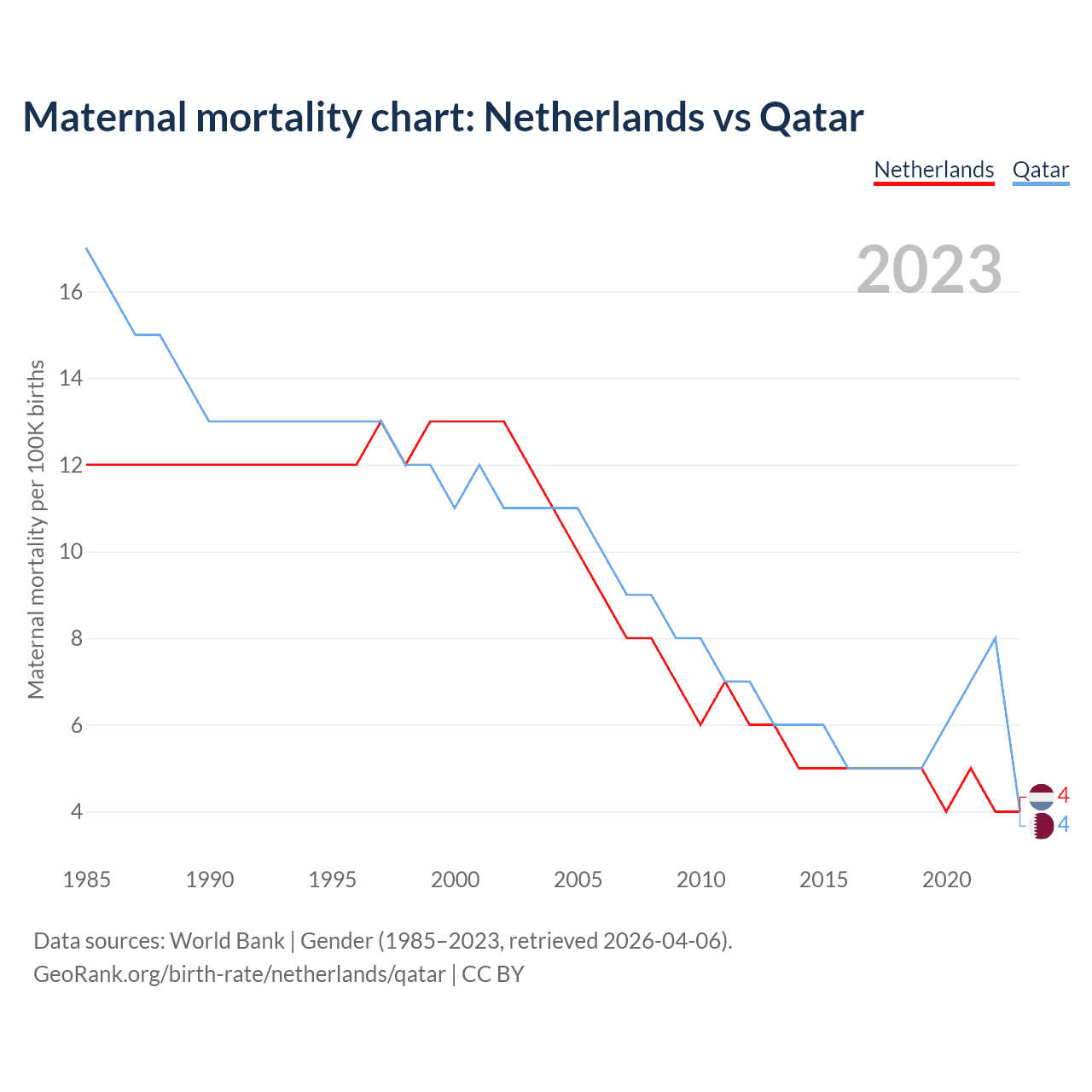 The maternal mortality rate, which is the probability of dying during childbirth or within 42 days of pregnancy termination, is 4 deaths per 100,000 live births in the Netherlands, compared to 4 deaths in Qatar.