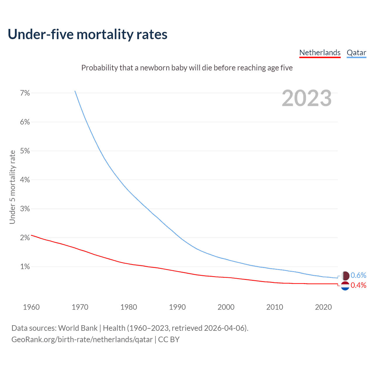 The chance that a newborn baby will die before reaching age five is 0.4% in the Netherlands and 0.6% in Qatar. Above is a chart with historical data on under-five mortality rates.