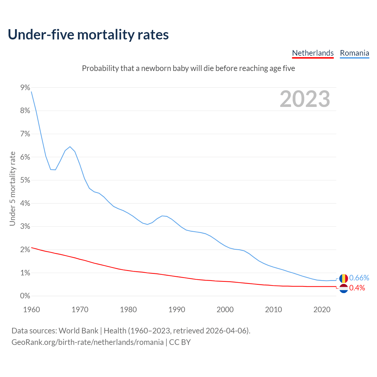 The chance that a newborn baby will die before reaching age five is 0.4% in the Netherlands and 0.66% in Romania. Above is a chart with historical data on under-five mortality rates.